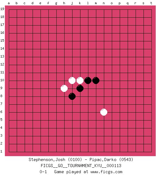 Last move : 0-1 2011 January 10 22:54:18 [Event "FICGS__GO__TOURNAMENT_KYU__000113"] [Site "FICGS"] [Date "2010.12.02"] [Round "1"] [Black "Stephenson,Josh"] [White "Pipac,Darko"] [Result "0-1"] [Rating 1 "0100"] [Rating 2 "0543"] 1.l10 n6 2.m10 k10 3.k9 j10 4.j8 h9 0-1 This go game has been lost on time (started : 2010.12.02 20:11:22) Here are the names of the openings (joseki) played in the four corners : Corner d4 : j8 h9 This joseki is unknown. A weak or weird move has probably been played in this corner. Player White won this Go (weiqi, baduk) game. Follow this game move after move (download)You can hide nothing on the goban. (Pierre Audouard) Home computers are being called upon to perform many new functions, including the consumption of homework formerly eaten by the dog. (Doug Larson)