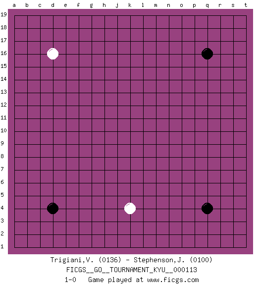 Last move : 1-0 2011 January 20 11:18:24 [Event "FICGS__GO__TOURNAMENT_KYU__000113"] [Site "FICGS"] [Date "2010.12.02"] [Round "1"] [Black "Trigiani,Vincenzo"] [White "Stephenson,Josh"] [Result "1-0"] [Rating 1 "0136"] [Rating 2 "0100"] 1.q4 d16 2.d4 k4 3.q16 1-0 This go game has been lost on time (started : 2010.12.02 20:11:22) Here are the names of the openings (joseki) played in the four corners : Corner q4 : q4 1-0 Hoshi (Hwajeom, Seongjeom, Xingwei`) 4-4 Point. The star or hoshi (4-4) point, emphasizing influence at the potential expense of territory. Player Black won this Go (weiqi, baduk) game. Follow this game move after move (download)Don't make dango's. (Anonymous) Games, world of games... There's always an opponent, and there's always a victim. (Revolver, movie)