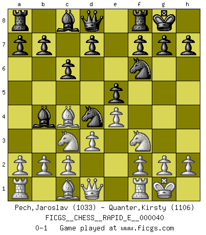 Last move : 0-1 2011 January 18 12:51:59 [Event "FICGS__CHESS__RAPID_E__000040"] [Site "FICGS"] [Date "2010.12.03"] [Round "1"] [White "Pech,Jaroslav"] [Black "Quanter,Kirsty"] [Result "0-1"] [WhiteElo "1033"] [BlackElo "1106"] 1.e4 e5 2.Nf3 Nc6 3.Nc3 Nf6 4.Bb5 Bb4 5.O-O O-O 6.d3 Nd4 7.Bc4 c6 0-1 Four knights : double Ruy Lopez Kingside Castling by player White (move 5) Kingside Castling by player Black (move 5) Player Black won this chess game. Follow this game move after move (download)It began to feel as though you were playing against Chess itself. - On playing against Robert Fischer. (Walter Shipman) Das Zentrum ist der Balkan des Schachbretts - Kriegshandlungen können in jedem Moment ausbrechen. (Aaron Nimzowitsch) Aún el Rey más flojo huye despavorido ante la amenaza de un Jaque doble. (Aaron Nimzowitsch) Il s'avisa de me proposer d'apprendre les échecs qu'il jouait un peu... me voilà forcené des échecs. J'achète un échiquier, je m'enferme dans ma chambre, j'y passe des jours et des nuits à vouloir apprendre par cur toutes les parties. (Jean-Jacques Rousseau, Confessions) Depression is just anger without enthusiasm. (Unknown)