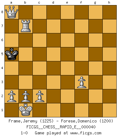 Last move : 1-0 2011 February 27 13:0:22 [Event "FICGS__CHESS__RAPID_E__000040"] [Site "FICGS"] [Date "2010.12.03"] [Round "1"] [White "Frame,Jeremy"] [Black "Forese,Domenico"] [Result "1-0"] [WhiteElo "1225"] [BlackElo "1200"] 1.e4 c5 2.Nf3 Nf6 3.Nc3 Nc6 4.d4 cxd4 5.Nxd4 Nxd4 6.Qxd4 e5 7.Qxe5+ Qe7 8.Qxe7+ Bxe7 9.Bd3 O-O 10.Bg5 h6 11.Bh4 Bc5 12.O-O-O Ng4 13.f3 Nf2 14.Bxf2 Bxf2 15.Bb5 a6 16.Bxd7 Be3+ 17.Kb1 Rd8 18.Bxc8 Rxd1+ 19.Rxd1 Rxc8 20.Rd7 b5 21.Nd5 Bg1 22.Ne7+ Kf8 23.Nxc8 Ke8 24.Rd6 Bxh2 25.Rxa6 Kd7 26.Na7 Kc7 27.Nxb5+ Kb7 28.Ra3 g6 29.Rd3 Kc6 30.Nd4+ Kc5 31.Ne2 g5 32.Rd1 h5 33.g3 h4 34.gxh4 gxh4 35.Rh1 Bf4 36.Nxf4 Kd4 37.Rxh4 Ke3 38.Rh7 Kxf4 39.Rxf7+ Ke3 40.e5 Kd4 41.e6 Ke5 42.e7 Ke6 43.e8Q+ Kd6 44.Rd7+ Kc5 45.Qc8+ Kb6 46.Rb7+ Ka5 47.Qa8+ 1-0 Sicilian : Nimzovich-Rubinstein variation Kingside Castling by player Black (move 9) Queenside Castling by player White (move 12) 10 pieces endgame at move 37 : White KRNPPPPP , Black KP WHITE : King + 1 Rook 1 Knight 5 Pawns BLACK : King + 1 Pawn 9 pieces endgame at move 38 : White KRPPPPP , Black KP WHITE : King + 1 Rook 5 Pawns BLACK : King + 1 Pawn 8 pieces endgame at move 39 : White KRPPPPP , Black K WHITE : King + 1 Rook 5 Pawns BLACK : King + Promotion Queen by player White (move 43) Player White won this chess game. Follow this game move after move (download)For me, Chess is life and every game is like a new life. Every Chess player gets to live many lives in one lifetime. (Eduard Gufeld) Wir können eben der zündenden Macht des Opfers nicht wiederstehen, denn die Begeisterung für das Opfer liegt in der Natur des Menschen. (Rudolf Spielmann) Me gusta decir que Bobby Fischer fue el mejor jugador que jamás haya existido. Pero lo que hizo de Fischer un genio, fue su habilidad de mezclar una frescura y pragmatismo Americano con ideas Rusas acerca de la estrategia. (Bruce Pandolfini) Des points faibles ou des trous dans la position de l'adversaire doivent être occupés par des pièces et non pas par des pions. (Siegbert Tarrasch) As a goal marker shodan is important. As a destination it is a poor place to stop. (Thomas Tamayo)