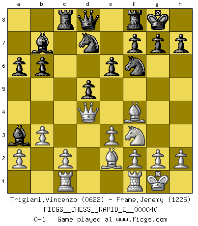 Last move : 0-1 2011 February 8 10:10:41 [Event "FICGS__CHESS__RAPID_E__000040"] [Site "FICGS"] [Date "2010.12.03"] [Round "1"] [White "Trigiani,Vincenzo"] [Black "Frame,Jeremy"] [Result "0-1"] [WhiteElo "0622"] [BlackElo "1225"] 1.d4 d5 2.Nc3 Nf6 3.Bf4 c6 4.Nf3 e6 5.e3 Nbd7 6.Be2 Be7 7.O-O b6 8.Qd3 Bb7 9.b3 c5 10.Nb5 O-O 11.Qc3 a6 12.Na3 cxd4 13.Qxd4 Rc8 14.Rac1 Bxa3 0-1 This chess game has been lost on time (started : 2010.12.03 0:20:50) Queen's pawn : Chigorin variation Kingside Castling by player White (move 7) Kingside Castling by player Black (move 10) Player Black won this chess game. Follow this game move after move (download)First-class players lose to second class players because second-class players sometimes play a first-class game. (Tarrasch) Ich bin Weltmeister und muß mit niemandem irgend etwas diskutieren. (Viswanathan Anand) Las ideas audaces son como las piezas del Ajedrez que avanzan hacia adelante. Ellas pueden ser vencidas, pero también pueden iniciar una partida victoriosa. (Goethe) Il a essayé de se convaincre qu'il pourrait empêcher toutes les erreurs et ne jamais perdre. L'horreur ! Gary Kasparov au sujet de Robert Fischer. There are two types of people in this world, good and bad. The good sleep better, but the bad seem to enjoy the waking hours much more. (Woody Allen)