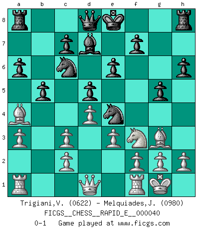 Last move : 0-1 2011 February 3 11:51:26 [Event "FICGS__CHESS__RAPID_E__000040"] [Site "FICGS"] [Date "2010.12.03"] [Round "1"] [White "Trigiani,Vincenzo"] [Black "Melquiades,Jay"] [Result "0-1"] [WhiteElo "0622"] [BlackElo "0980"] 1.d4 d5 2.Nc3 e6 3.Bf4 Bb4 4.e3 Nc6 5.a3 Bxc3+ 6.bxc3 Nf6 7.Nf3 h6 8.Bd3 g5 9.Bg3 Bd7 10.Bb5 Ne4 11.O-O a6 12.Ba4 b5 0-1 This chess game has been lost on time (started : 2010.12.03 0:20:50) Queen's pawn : Chigorin variation Kingside Castling by player White (move 11) Player Black won this chess game. Follow this game move after move (download)When I asked Fischer why he had not played a certain move in our game, he replied: 'Well, you laughed when I wrote it down !' (Mikhail Tal) Ich liebe den Moment, wenn ich das Ego meines Gegenüber breche. (Robert James Fischer) Fischer sacrificó virtualmente todo lo que la mayoría de nosotros los 'debiles' (término que él usa) valoramos, respetamos y apreciamos por el amor de un astuto, a menudo hermoso tablero de juego, por el privilegio ambivalente de ser su mas grande maestro. (Paul Kollar) Les échecs, c'est l'imagination. (David Bronstein) Optimism is a variety of information deficit. Sometimes especially true for correspondence chess games. (Michael Aigner)
