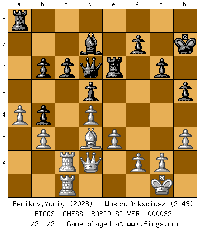 Last move : 1/2-1/2 2011 February 25 12:19:2 [Event "FICGS__CHESS__RAPID_SILVER__000032"] [Site "FICGS"] [Date "2010.12.03"] [Round "2"] [White "Perikov,Yuriy"] [Black "Wosch,Arkadiusz"] [Result "1/2-1/2"] [WhiteElo "2028"] [BlackElo "2149"] 1.d4 Nf6 2.c4 e6 3.Nf3 d5 4.Nc3 c6 5.e3 Nbd7 6.Qc2 Bd6 7.Bd3 O-O 8.cxd5 exd5 9.O-O Re8 10.Re1 Nb6 11.h3 h6 12.b3 Be6 13.a4 a5 14.Ba3 Bxa3 15.Rxa3 Nbd7 16.Ra2 Nb8 17.Rb2 Qe7 18.Reb1 Na6 19.Na2 Nb4 20.Nxb4 axb4 21.Ne5 Ra5 22.Rc1 Nd7 23.Nxd7 Bxd7 24.Qd2 g6 25.Rbc2 R5a8 26.Rc5 b6 27.R5c2 Kg7 28.Be2 h5 29.Bf1 Qd6 30.Bd3 Re7 31.Be2 Re6 32.Bd3 Kh7 1/2-1/2 Queen's pawn game Kingside Castling by player Black (move 7) Kingside Castling by player White (move 9) This chess game ended in a draw. Follow this game move after move (download)Not all artists are Chess players, but all Chess players are artists. (Marcel Duchamp) Ich rechne überhaupt nicht voraus. Ich gewinne auch so. (Robert James Fischer) Las ideas audaces son como las piezas del Ajedrez que avanzan hacia adelante. Ellas pueden ser vencidas, pero también pueden iniciar una partida victoriosa. (Goethe) Aidez vos pièces, elles vous aideront. (Paul Morphy) Beta. Software undergoes beta testing shortly before it's released. Beta is latin for still doesn't work. (Anonymous)