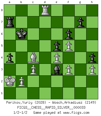 Last move : 1/2-1/2 2011 April 9 9:9:33 [Event "FICGS__CHESS__RAPID_SILVER__000033"] [Site "FICGS"] [Date "2010.12.03"] [Round "2"] [White "Perikov,Yuriy"] [Black "Wosch,Arkadiusz"] [Result "1/2-1/2"] [WhiteElo "2028"] [BlackElo "2149"] 1.e4 c5 2.Nf3 Nc6 3.Nc3 e6 4.d4 cxd4 5.Nxd4 Nf6 6.a3 d6 7.Bc4 Be7 8.O-O O-O 9.Ba2 a6 10.Be3 Bd7 11.f4 Rc8 12.Qf3 Qa5 13.Rae1 Nxd4 14.Bxd4 e5 15.Bf2 Bg4 16.Qe3 Bd7 17.f5 Bd8 18.Kh1 Bc6 19.Qd3 Re8 20.Qf3 h6 21.Bh4 Rf8 22.Rd1 Qc7 23.Bxf6 Bxf6 24.Rf2 Qb6 25.Bb3 Rfd8 26.Rfd2 Bg5 27.Rxd6 Rxd6 28.Rxd6 Qe3 29.Rd1 Qxf3 30.gxf3 Kf8 31.Kg2 Be3 32.Nd5 Bxd5 33.Rxd5 Re8 34.Rd3 Bc1 35.Bd5 b5 36.Rb3 Rc8 37.c3 Rc7 38.Kf2 Ke7 39.Ke2 h5 40.Rb4 h4 41.h3 Kd6 42.Kd3 Bf4 43.a4 Kc5 44.Rb3 f6 45.Kc2 bxa4 46.Rb4 a5 47.Rxa4 Kb5 48.Ra1 a4 49.Rd1 Ra7 50.Be6 Kc6 51.Kb1 Bh6 52.Ka2 Bf4 53.Rd8 Be3 54.Bc4 Kc7 55.Rf8 Kb6 56.Rd8 1/2-1/2 Sicilian defense Kingside Castling by player White (move 8) Kingside Castling by player Black (move 8) This chess game ended in a draw. Follow this game move after move (download)All Chess players should have a hobby. (Savielly Tartakower) Im Schach nämlich geht es darum, daß Ich des Gegners klein zu kriegen, sein Ego zu zerbrechen und zu zermahlen, seine Selbstachtung zu zertreten und zu verscharren und seine ganze mißachtenswerte sogenannte Persönlichkeit ein für alle Mal tot zu hacken und zu zerstampfen und dadurch die menschliche Gesellschaft von einer stinkenden Pestbeule zu befreien. Es ist ein königliches Spiel. (Robert James Fischer) ¿Porque tengo que perder ante este idiota?. (Aron Nimzovich) On peut tirer plus d'utilité d'une partie perdue que de 100 parties gagnées. (Capablanca) Without deviation from the norm, progress is not possible. (Frank Zappa)