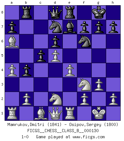 Last move : 1-0 2010 December 11 7:28:57 [Event "FICGS__CHESS__CLASS_B__000130"] [Site "FICGS"] [Date "2010.12.04"] [Round "1"] [White "Mamrukov,Dmitri"] [Black "Osipov,Sergey"] [Result "1-0"] [WhiteElo "1841"] [BlackElo "1800"] 1.d4 Nf6 2.c4 e6 3.g3 c5 4.d5 exd5 5.cxd5 b5 6.Bg2 d6 7.e4 Nbd7 8.Nf3 Rb8 9.O-O Be7 10.a4 b4 11.Nbd2 Ba6 12.Re1 O-O 13.Bf1 Re8 14.Bxa6 1-0 Catalan Opening Kingside Castling by player White (move 9) Kingside Castling by player Black (move 12) Player White won this chess game. Follow this game move after move (download)Not only will I predict his triumph over Botvinnik, but I'll go further and say that he'll probably be the greatest Chess player that ever lived. (John Collins) Habe Mut, dich deines eigenen Verstandes zu bedienen. (Immanuel Kant) Coloca el contenido de las piezas del Ajedrez en un sombrero, agitalo vigorosamente, arrojalas en un tablero desde una altura de 30 centimetros y así obtendras el estilo de Steinitz. (H. E. Bird) Le moment que je préfère le plus dans une rencontre, c'est celui où je sens que la personnalité de l'adversaire se brise. (Robert Fischer) Coffee just isn't my cup of tea. (Unknown)
