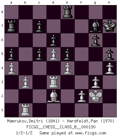 Last move : 1/2-1/2 2011 February 14 9:16:56 [Event "FICGS__CHESS__CLASS_B__000130"] [Site "FICGS"] [Date "2010.12.04"] [Round "1"] [White "Mamrukov,Dmitri"] [Black "Hardfeldt,Pan"] [Result "1/2-1/2"] [WhiteElo "1841"] [BlackElo "1970"] 1.d4 f5 2.Nf3 Nf6 3.g3 g6 4.Bg2 Bg7 5.O-O d6 6.b3 O-O 7.Bb2 Ne4 8.Nbd2 Nc6 9.c4 a5 10.Nxe4 fxe4 11.Ng5 e5 12.d5 Qxg5 13.dxc6 bxc6 14.Bxe4 Bb7 15.Qd3 Qd8 16.Rad1 Qc8 17.a4 c5 18.Bd5+ Bxd5 19.Qxd5+ Kh8 20.Bc3 Ra7 21.Rd3 Qa8 22.e4 h5 23.Kg2 Kh7 24.Bd2 Qxd5 25.cxd5 Rb8 26.h4 Re8 27.Rb1 1/2-1/2 Dutch Kingside Castling by player White (move 5) Kingside Castling by player Black (move 6) This chess game ended in a draw. Follow this game move after move (download)If cunning alone were needed to excel, women would be the best Chess players. (Albin) Ich kämpfe solange mein Gegner einen Fehler machen kann. (Emanuel Lasker) El Ajedrez es realmente noventa y nueve por ciento calculación. (Soltis) Assurément je connaissais par expérience le mystérieux attrait de ce jeu royal, le seul entre tous les jeux inventés par les hommes qui échappe souverainement à la tyrannie du hasard, le seul où l'on ne doive sa victoire qu'à son intelligence ou plutôt à une certaine forme d'intelligence. Mais n'est-ce pas déjà le limiter injurieusement que d'appeler les échecs un jeu ? N'est-ce pas une science, un art ou quelque chose qui, comme le cercueil de Mahomet entre ciel et terre, est suspendu entre l'un et l'autre, et qui réunit un nombre incroyable de contraires ? [...] C'est une pensée qui ne mène à rien, une mathématique qui n'établit rien, un art qui ne laisse pas d'uvre, une architecture sans matière; et il l'a prouvé néanmoins qu'il était plus durable, à sa manière, que les livres ou que tout autre monument, ce jeu unique qui appartient à tous les peuples et à tous les temps, et dont personne ne sait quel dieu en fit don à la terre pour tuer l'ennui, pour aiguiser l'esprit et stimuler l'âme. Où commence-t-il, où finit-il ? (Stefan Zweig) The message for business people contemplating their place in the cyberspace is simple and direct: get linked or get lost. (Vic Sussman and Kenan Pollack)