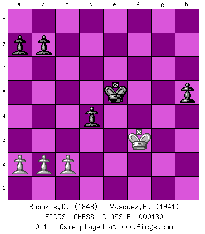 Last move : 0-1 2011 June 20 16:47:30 [Event "FICGS__CHESS__CLASS_B__000130"] [Site "FICGS"] [Date "2010.12.04"] [Round "1"] [White "Ropokis,Dimitrios"] [Black "Vasquez,Fernando"] [Result "0-1"] [WhiteElo "1848"] [BlackElo "1941"] 1.e4 e5 2.f4 exf4 3.Nf3 g5 4.h4 g4 5.Ne5 Qe7 6.d4 d6 7.Nxg4 Qxe4+ 8.Qe2 Qe7 9.Qxe7+ Bxe7 10.Be2 h5 11.Nf2 Nh6 12.Nd2 Rg8 13.Nf3 Nf5 14.Bxf4 Rxg2 15.Bf1 Rg7 16.O-O-O Bd7 17.Bh3 Ng3 18.Rhe1 Bxh3 19.Nxh3 Kd7 20.Nhg5 Nf5 21.Ne4 Rg6 22.Bd2 Nxh4 23.Nxh4 Bxh4 24.Rf1 Rg4 25.Nc3 Nc6 26.Rxf7+ Ne7 27.Nd5 c6 28.Ne3 Rxd4 29.Nf5 Rxd2 30.Rxd2 Ke6 31.Rxd6+ Kxf7 32.Nxh4 Rg8 33.Nf3 Rg3 34.Nh4 Rh3 35.Rd4 Kf6 36.Kd1 Nd5 37.Ke2 Ke5 38.Nf3+ Rxf3 39.Rxd5+ cxd5 40.Kxf3 d4 0-1 KGA : Kieseritsky, Salvio (Rosenthal) defense Queenside Castling by player White (move 16) 10 pieces endgame at move 39 : White KPPP , Black KRPPPP WHITE : King + 3 Pawns BLACK : King + 1 Rook 4 Pawns 9 pieces endgame at move 40 : White KPPP , Black KPPPP WHITE : King + 3 Pawns BLACK : King + 4 Pawns Player Black won this chess game. Follow this game move after move (download)Chess is a terrible game. If you have no center, your opponent has a freer position. If you do have a center, then you really have something to worry about ! (Siegbert Tarrasch) Ohne Leiden bildet sich kein Charakter. (Ernst Freiherr von Feuchtersleben) Todavía soy una víctima del Ajedrez. Tiene toda la belleza del arte y mucho mas. No puede ser comercializado. El Ajedrez es mas puro que el arte en su posición social. (Marcel Duchamp) Je crois qu'il existe des manières très spécifiques de jouer efficacement contre une machine. Evidemment, nous n'avons aucune chance en technique pure, parce que l'ordinateur calcule de manière parfaite. Mais lorsque nous faisons appel à notre cerveau, en utilisant l'intuition et la compréhension, alors nous restons beaucoup plus forts. (Anatoli Karpov) The best teachers teach from the heart, not from the book. (Author unknown)