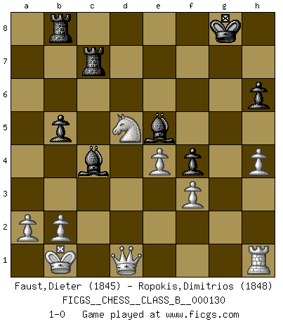 Last move : 1-0 2011 January 16 12:43:27 [Event "FICGS__CHESS__CLASS_B__000130"] [Site "FICGS"] [Date "2010.12.04"] [Round "1"] [White "Faust,Dieter"] [Black "Ropokis,Dimitrios"] [Result "1-0"] [WhiteElo "1845"] [BlackElo "1848"] 1.d4 Nf6 2.c4 e5 3.dxe5 Ng4 4.Bf4 g5 5.Bd2 Nc6 6.Nc3 Ngxe5 7.Nf3 h6 8.h4 g4 9.Nxe5 Nxe5 10.Qb3 Bg7 11.e4 O-O 12.O-O-O d6 13.Be2 a5 14.Be3 Bd7 15.c5 a4 16.Qa3 f5 17.cxd6 f4 18.Bc5 Rc8 19.Kb1 cxd6 20.Bxd6 Rf7 21.Bxe5 Bxe5 22.Nxa4 Qc7 23.Rc1 Bc6 24.f3 Ra8 25.Bb5 gxf3 26.gxf3 Bxb5 27.Rxc7 Rxc7 28.Qb3+ Bc4 29.Qd1 b5 30.Nc3 Rb8 31.Nd5 1-0 Budapest : Rubinstein variation Kingside Castling by player Black (move 11) Queenside Castling by player White (move 12) Player White won this chess game. Follow this game move after move (download)The defensive power of a pinned piece is only imaginary. (Aaron Nimzovich) Der Schachmeister von Heute braucht Courage, einen Killerinstinkt, Ausdauer und Arroganz. (Larry Evans) De todos mis libros Rusos, la defensa contiene y difunde el 'calor' mas grande que pudiese verse extraño al observar lo supremamente abstracto que el Ajedrez supuestamente es. (Vladimir Nabokov) Soyez une menace à chaque fois que vous vous asseyez pour jouer. (Ken Smith) Life is verb, not a noun. (Charlotte Perkins Gilman)