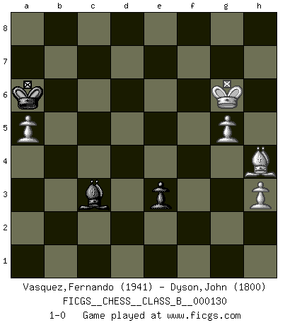 Last move : 1-0 2011 November 16 22:19:42 [Event "FICGS__CHESS__CLASS_B__000130"] [Site "FICGS"] [Date "2010.12.04"] [Round "1"] [White "Vasquez,Fernando"] [Black "Dyson,John"] [Result "1-0"] [WhiteElo "1941"] [BlackElo "1800"] 1.e4 d6 2.d4 Nf6 3.Nc3 g6 4.Nf3 Bg7 5.Be2 O-O 6.O-O c6 7.Re1 Nbd7 8.Bg5 Qb6 9.Rb1 Re8 10.Qd2 e5 11.dxe5 dxe5 12.b4 Nf8 13.b5 Rd8 14.Qe3 Qxe3 15.Bxe3 cxb5 16.Nxb5 Bg4 17.h3 Bxf3 18.Bxf3 b6 19.Red1 Rdc8 20.Rd3 Ne6 21.Ra3 Rxc2 22.Bd1 R2c8 23.Rxa7 Nxe4 24.Bf3 Rxa7 25.Nxa7 Rc4 26.Rxb6 Nc3 27.Nb5 e4 28.Bg4 Nxb5 29.Bxe6 fxe6 30.Rxb5 Ra4 31.Rb8+ Kf7 32.Rb7+ Kf6 33.g4 h6 34.Ra7 Rxa7 35.Bxa7 Ke5 36.Kf1 Kd5 37.a4 Kc6 38.Ke2 Kb7 39.Be3 Ka6 40.Bd2 h5 41.g5 Bd4 42.f3 exf3+ 43.Kxf3 Kb7 44.Ke4 Bb2 45.a5 Ka6 46.Bb4 e5 47.Bd2 h4 48.Kd5 Bd4 49.Ke6 e4 50.Kf7 e3 51.Be1 Be5 52.Bxh4 Bc3 53.Kxg6 1-0 Pirc : Classical system, 5.Be2 Kingside Castling by player Black (move 5) Kingside Castling by player White (move 6) 10 pieces endgame at move 43 : White KBPPP , Black KBPPP WHITE : King + 1 Bishop 3 Pawns BLACK : King + 1 Bishop 3 Pawns 9 pieces endgame at move 52 : White KBPPP , Black KBPP WHITE : King + 1 Bishop 3 Pawns BLACK : King + 1 Bishop 2 Pawns 8 pieces endgame at move 53 : White KBPPP , Black KBP WHITE : King + 1 Bishop 3 Pawns BLACK : King + 1 Bishop 1 Pawn Player White won this chess game. Follow this game move after move (download)Let the perfectionist play postal. (Yasser Seirawan) Wenn Capablanka heute auf der Schachbühne erscheinen würde, hätte er ein halbes Jahr gebraucht um sich die Schachtheorie anzueignen. Und dann hätte er alles und jeden besiegt. (Mikhail Moiseyevich Botvinik) La vida es como un juego de Ajedrez, cambiando con cada movimiento. (Proverbio Chino) Une platitude souvent récitée à propos des Echecs est qu'une des choses les plus difficiles à réaliser est de gagner une position gagnante. Cela ne manque pas de sens mais, pour ma part, j'ai toujours trouvé plus difficile de gagner une position perdante. (Tim Krabbe) Unless I accept my faults I will most certainly doubt my virtues. (Hugh Prather)