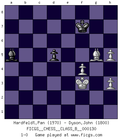 Last move : 1-0 2011 August 10 20:35:10 [Event "FICGS__CHESS__CLASS_B__000130"] [Site "FICGS"] [Date "2010.12.04"] [Round "1"] [White "Hardfeldt,Pan"] [Black "Dyson,John"] [Result "1-0"] [WhiteElo "1970"] [BlackElo "1800"] 1.e4 d6 2.d4 Nf6 3.Bd3 e5 4.c3 d5 5.dxe5 Nxe4 6.Nf3 Nc6 7.Nbd2 Nc5 8.Bb1 Bg4 9.O-O Be7 10.b4 Ne6 11.Qe2 a6 12.Re1 O-O 13.h3 Bh5 14.Nb3 h6 15.Qe3 Re8 16.g4 Bg6 17.Bxg6 fxg6 18.Qd3 g5 19.a4 Rf8 20.Bd2 Qd7 21.Kg2 b6 22.b5 Na5 23.Nxa5 bxa5 24.bxa6 Nc5 25.Qe2 Rxa6 26.Be3 Rb6 27.Rad1 c6 28.Qc2 Rb7 29.Nd4 Ne6 30.Rb1 Nxd4 31.cxd4 Rb4 32.Rec1 c5 33.dxc5 Qc6 34.Rxb4 axb4 35.Bd4 Ra8 36.Ra1 Bd8 37.Qd3 Bc7 38.Qb5 Qg6 39.Re1 Qf7 40.a5 Rxa5 41.Qxb4 Ra8 42.Qb3 Rb8 43.Qe3 Re8 44.e6 Qf4 45.Qxf4 Bxf4 46.c6 Bd6 47.Rb1 Rxe6 48.Rb7 Bf4 49.c7 Re8 50.Bxg7 h5 51.Bf6 Rc8 52.gxh5 Rxc7 53.Rxc7 Bxc7 54.Bxg5 Ba5 55.f4 Kf7 56.Kf3 1-0 King's pawn Opening Kingside Castling by player White (move 9) Kingside Castling by player Black (move 12) 10 pieces endgame at move 53 : White KRBPPP , Black KBPP WHITE : King + 1 Rook 1 Bishop 3 Pawns BLACK : King + 1 Bishop 2 Pawns 9 pieces endgame at move 53 : White KBPPP , Black KBPP WHITE : King + 1 Bishop 3 Pawns BLACK : King + 1 Bishop 2 Pawns 8 pieces endgame at move 54 : White KBPPP , Black KBP WHITE : King + 1 Bishop 3 Pawns BLACK : King + 1 Bishop 1 Pawn Player White won this chess game. Follow this game move after move (download)Whoever sees no other aim in the game than that of giving checkmate to one's opponent will never become a good Chess player. (Euwe) Ich liebe den Moment, wenn ich das Ego meines Gegenüber breche. (Robert James Fischer) Fischer deseaba darle a los Rusos una sopa de su propia medicina. (Larry Evans) Il s'avisa de me proposer d'apprendre les échecs qu'il jouait un peu... me voilà forcené des échecs. J'achète un échiquier, je m'enferme dans ma chambre, j'y passe des jours et des nuits à vouloir apprendre par cur toutes les parties. (Jean-Jacques Rousseau, Confessions) It's not the size of the dog in the fight, it's the size of the fight in the dog. (Mark Twain)
