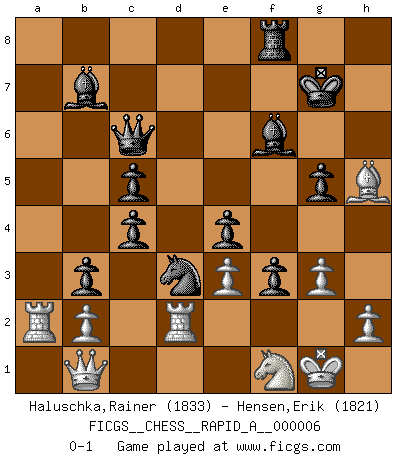 Last move : 0-1 2007 March 25 12:16:11 [Event "FICGS__CHESS__RAPID_A__000006"] [Site "FICGS"] [Date "2006.12.03"] [Round "1"] [White "Haluschka,Rainer"] [Black "Hensen,Erik"] [Result "0-1"] [WhiteElo "1833"] [BlackElo "1821"] 1.d4 Nf6 2.c4 e6 3.Nf3 d5 4.g3 Be7 5.Bg2 O-O 6.O-O dxc4 7.Qc2 a6 8.Bg5 b5 9.Bxf6 Bxf6 10.Ng5 Bxg5 11.Bxa8 Qxd4 12.Rd1 Qb6 13.Bf3 f5 14.Nd2 Nc6 15.Qc1 Bf6 16.Bg2 Nd4 17.Kf1 c5 18.a4 Bb7 19.Re1 Rd8 20.Ra3 Nc6 21.Re3 e5 22.Ra3 h6 23.Kg1 e4 24.Bh3 Bg5 25.axb5 axb5 26.e3 Ne5 27.Rd1 g6 28.Ra2 Nd3 29.Qb1 h5 30.Bf1 Bf6 31.Qa1 h4 32.Be2 Kg7 33.Qb1 Qc7 34.Qa1 hxg3 35.fxg3 g5 36.Nf1 Qc6 37.Rd2 f4 38.Bh5 Rf8 39.Re2 f3 40.Rd2 b4 41.Qb1 b3 0-1 Queen's pawn game Kingside Castling by player Black (move 5) Kingside Castling by player White (move 6) Player Black won this chess game. Follow this game move after move (download)A bad plan is better than none at all. (Frank Marshall) Was ist der Unterschied zwischen einem Strassenarbeiter und einem Schachspieler? --Der Schachspieler bewegt sich ab und zu. (Anonymous) El Ajedrez por encima de todo... ¡es una pelea!. (Emanuel Lasker) Les Echecs sont affaire de jugement sensible. Savoir quand frapper et quand esquiver. (Fischer) Panic is a sudden desertion of us, an a going over to the enemy of our imagination. (Christian Nevell Bovee)
