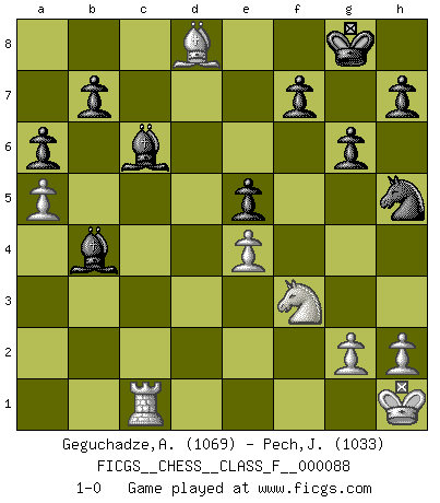 Last move : 1-0 2011 September 24 10:53:39 [Event "FICGS__CHESS__CLASS_F__000088"] [Site "FICGS"] [Date "2010.12.04"] [Round "1"] [White "Geguchadze,Alexander"] [Black "Pech,Jaroslav"] [Result "1-0"] [WhiteElo "1069"] [BlackElo "1033"] 1.e4 c5 2.Nf3 e6 3.d4 cxd4 4.Nxd4 a6 5.Nc3 Qc7 6.Bd3 Nf6 7.f4 d6 8.O-O Be7 9.Kh1 Nbd7 10.a4 Nc5 11.a5 O-O 12.Be3 Bd7 13.Qf3 Rac8 14.Be2 Rfe8 15.Rfd1 Bf8 16.b4 Nb3 17.Ra3 Qxc3 18.Rxb3 Qc7 19.Bd3 e5 20.fxe5 Bg4 21.Qg3 dxe5 22.Nf3 Bd7 23.Bb6 Qd6 24.R3b1 Qe6 25.c4 Ba4 26.Rd2 Rxc4 27.Ng5 Qc6 28.Bxc4 Qxc4 29.Rd8 Rxd8 30.Bxd8 Nh5 31.Qh3 g6 32.Qa3 Bc6 33.Rc1 Qxb4 34.Qxb4 Bxb4 35.Nf3 1-0 This chess game has been lost on time (started : 2010.12.04 19:40:24) Sicilian : Kan, 5.Nc3 Kingside Castling by player White (move 8) Kingside Castling by player Black (move 11) Player White won this chess game. Follow this game move after move (download)First-class players lose to second-class players because second-class players sometimes play a first-class game. (Siegbert Tarrasch) Schach ist Krieg, im Schach geht es um testosterongesteuerte Urschreie. (Garry Kasparov) No puedes jugar al Ajedrez si eres de corazón noble. (Proverbio Francés) Soyez une menace à chaque fois que vous vous asseyez pour jouer. (Ken Smith) Life is like a game of cards: the hand you are dealt represents determinism; the way you play it is free will. (Jawaharlal Nehru)