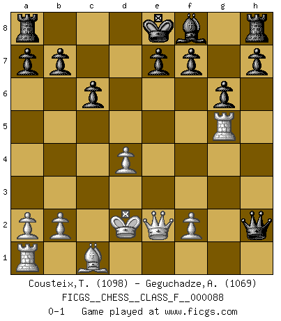 Last move : 0-1 2011 March 16 0:20:58 [Event "FICGS__CHESS__CLASS_F__000088"] [Site "FICGS"] [Date "2010.12.04"] [Round "1"] [White "Cousteix,Thierry"] [Black "Geguchadze,Alexander"] [Result "0-1"] [WhiteElo "1098"] [BlackElo "1069"] 1.Nf3 Nf6 2.d4 d5 3.c4 c6 4.Nc3 Bf5 5.Ne5 dxc4 6.e3 Nbd7 7.Nxd7 Qxd7 8.e4 Nxe4 9.Nxe4 Bxe4 10.Bxc4 Bxg2 11.Rg1 Bd5 12.Bxd5 Qxd5 13.Rg5 Qh1+ 14.Kd2 Qxh2 15.Qe2 g6 0-1 This chess game has been lost on time (started : 2010.12.04 19:40:24) Reti Opening Player Black won this chess game. Follow this game move after move (download)The hardest game to win is a won game. (Emanuel Lasker) Ich moechte nie einem Club beitreten, der Leute wie mich als Mitglieder aufnimmt. (Woody Allen) La maestría del Ajedrez consiste esencialmente en analizar posiciónes de Ajedrez con precisión. (Mikhail Botvinnik) Aux échecs, l'amour-propre est satisfait quand on remporte la victoire, mais il n'y a pas de honte à être battu. (Benjamin Franklin) Wikichess, chess moves explained by 'experimented' players. (Thibault de Vassal)