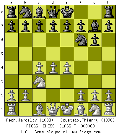 Last move : 1-0 2011 February 17 22:14:1 [Event "FICGS__CHESS__CLASS_F__000088"] [Site "FICGS"] [Date "2010.12.04"] [Round "1"] [White "Pech,Jaroslav"] [Black "Cousteix,Thierry"] [Result "1-0"] [WhiteElo "1033"] [BlackElo "1098"] 1.c4 Nf6 2.Nc3 g6 3.d4 Bg7 4.e4 1-0 This chess game has been lost on time (started : 2010.12.04 19:40:24) English Opening Player White won this chess game. Follow this game move after move (download)Fischer sacrificed virtually everything most of us weakies (to use his term) value, respect, and cherish, for the sake of an artful, often beautiful board game, for the ambivalent privilege of being its greatest master. (Paul Kollar) Mit sehr nachdenklichem Gesicht schreitet Bobby durch den Turniersaal. Was ist passiert?, fragt Lombardy. Ich stehe schlecht, antwortet Fischer. Lombardy: Dann biete doch einfach Remis an. Fischer: So schlecht stehe ich nun auch wieder nicht! (Robert James Fischer) Algunos sacrificios son sólidos, los demás son míos. (Mikhail Tal) J'apprécie les joueurs d'est-indienne, c'est grâce à eux que je nourris ma famille depuis tant d'années. (Petrosian) Never was anything great achieved without danger. (Niccolo Machiavelli)