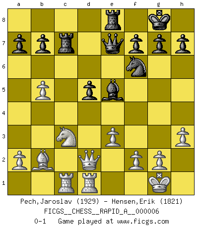 Last move : 0-1 2007 February 12 16:9:10 [Event "FICGS__CHESS__RAPID_A__000006"] [Site "FICGS"] [Date "2006.12.03"] [Round "1"] [White "Pech,Jaroslav"] [Black "Hensen,Erik"] [Result "0-1"] [WhiteElo "1929"] [BlackElo "1821"] 1.Nf3 d5 2.c4 e6 3.b3 Nf6 4.e3 c5 5.Bb2 Nc6 6.cxd5 exd5 7.Be2 Bd6 8.d4 cxd4 9.Nxd4 O-O 10.O-O Re8 11.Nc3 Nxd4 12.Qxd4 Be5 13.Qd2 Bg4 14.Bxg4 Nxg4 15.h3 Nf6 16.Rfd1 Rc8 17.Rac1 Rc6 18.b4 Qe7 19.b5 Rc7 0-1 This chess game has been lost on time (started : 2006.12.03 10:30:27) Reti Opening Kingside Castling by player Black (move 9) Kingside Castling by player White (move 10) Player Black won this chess game. Follow this game move after move (download)When your house is on fire, you can't be bothered with the neighbors. Or, as we say in Chess, if your King is under attack you don't worry about losing a Pawn on the Queen's side. (Gary Kasparov) Wenn du auf das Glück wartest, wird das Leben ziemlich langweilig. (Mikhail Nekhemyevich Tal) En partidas rápidas, el Caballo es mas poderoso que el Alfil. (Vlastimil Hort) Le pion, dans sa simplicité, marche droit devant lui, mais lorsqu'il prend, il le fait obliquement? Ainsi l'homme, tant qu'il reste pauvre, marche dans la droiture et vit honnêtement, mais lorsqu'il recherche les honneurs, il flatte, se parjure et, par les voies obliques, cherche une position supérieure sur l'échiquier du monde. (Jean de Galles) Everybody lies. (Gregory House, House M.D.)