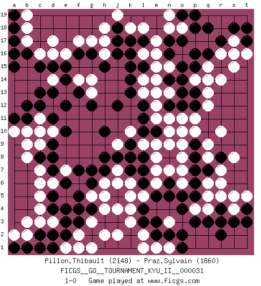 Last move : 1-0 2010 December 31 16:53:30 [Event "FICGS__GO__TOURNAMENT_KYU_II__000031"] [Site "FICGS"] [Date "2010.12.05"] [Round "1"] [Black "Pillon,Thibault"] [White "Praz,Sylvain"] [Result "1-0"] [Rating 1 "2148"] [Rating 2 "1860"] 1.q16 d17 2.r4 d3 3.p3 r10 4.c15 e16 5.r8 r14 6.o17 s16 7.j3 d14 8.c13 m17 9.r17 q12 10.d5 c7 11.c10 c5 12.d4 c4 13.e3 d6 14.d2 c3 15.f4 m15 16.k17 h17 17.k15 l16 18.k16 s17 19.o14 m13 20.o12 m11 21.h15 o10 22.q18 n18 23.s18 o18 24.p18 d12 25.c12 d10 26.d13 f14 27.j12 k10 28.h10 r6 29.p7 s4 30.s3 q8 31.q7 r7 32.p5 s8 33.f13 e13 34.e12 g13 35.e14 g14 36.l12 m12 37.g12 c16 38.g16 g17 39.e15 k4 40.l6 n3 41.l3 k3 42.l4 l2 43.m2 j2 44.m3 k5 45.h3 l5 46.m5 m6 47.n5 m7 48.l8 m1 49.n2 h2 50.g2 g3 51.g4 h4 52.h7 j7 53.l7 m8 54.j8 k8 55.k7 j6 56.k9 l9 57.g7 j9 58.h8 k8 59.f16 f17 60.k9 j4 61.k8 f2 62.l10 m9 63.m10 n10 64.l11 l13 65.k13 o11 66.p8 q9 67.p9 p10 68.e2 g5 69.f5 f6 70.g6 h5 71.e6 b9 72.d7 c6 73.d8 c9 74.d9 c11 75.d11 b10 76.e10 n1 77.o2 s5 78.j18 h18 79.c2 b2 80.b1 a2 81.b16 b17 82.a15 q5 83.a17 b18 84.r15 s15 85.q14 q13 86.b11 r3 87.r2 q4 88.q3 p4 89.p6 n9 90.o4 p14 91.p15 q15 92.n16 m16 93.q14 e5 94.e4 q15 95.n14 m14 96.q14 e7 97.f7 q15 98.c8 b8 99.q14 o6 100.o5 q15 101.p16 c10 102.a11 a10 103.b12 r16 104.d15 d16 105.n12 n11 106.o1 l1 107.a18 b19 108.p13 n13 109.o13 n15 110.o15 q14 111.t17 t16 112.t18 h16 113.j16 l18 114.o19 n19 115.p19 k18 116.j17 j19 117.k14 e1 118.d1 f1 119.f3 g1 120.t4 t5 121.t3 o7 122.p12 p11 123.n17 r5 124.r3 o8 125.n6 n7 126.a16 h6 127.c1 k6 128.a1 b3 129.l17 o9 130.a19 l14 131.l15 q6 132.pass 1-0 Here are the names of the openings (joseki) played in the four corners : Corner d16 : d17 c15 Komoku (Somok, Xiao~mu`) 3-4 Point. The komoku (3-4) point is the traditional corner enclosure move.. Ikken Kakari (Hankan Keolch'im, Yi Gua`jiao~, 1-Space Low Pincer). The small knight move is the basic approach move to the 3-4 point stone. It has been continually used for over four centuries. There are limitless variations, with new moves constantly being discovered. Black 2 opens the door to a treaure store of joseki. Corner q16 : q16 r14 Hoshi (Hwajeom, Seongjeom, Xingwei`) 4-4 Point. The star or hoshi (4-4) point, emphasizing influence at the potential expense of territory. Ikken Kakari (Hankan Keolch'im, Yi Gua`jiao~, 1-Space Low Approach). White 2 is the standard approach move to the 4-4. Corner d4 : d3 j3 Komoku (Somok, Xiao~mu`) 3-4 Point. The komoku (3-4) point is the traditional corner enclosure move.. Player Black won this Go (weiqi, baduk) game. Follow this game move after move (download)At the head of two stones in a row, play hane. (Anonymous) The project of the man are lower than those of the sky. (Chinese proverb)