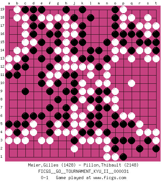 Last move : 0-1 2010 December 18 18:37:27 [Event "FICGS__GO__TOURNAMENT_KYU_II__000031"] [Site "FICGS"] [Date "2010.12.05"] [Round "1"] [Black "Meier,Gilles"] [White "Pillon,Thibault"] [Result "0-1"] [Rating 1 "1428"] [Rating 2 "2148"] 1.q16 d4 2.d16 r4 3.c6 f3 4.c9 r14 5.o17 q10 6.p3 n3 7.p5 q6 8.r2 k3 9.k16 c14 10.c12 f17 11.e15 c17 12.d17 c16 13.g15 j17 14.k17 k18 15.l18 j16 16.j15 e18 17.d18 h18 18.k19 h16 19.g16 j19 20.j18 h15 21.h19 h14 22.e13 c18 23.e19 k14 24.j14 j13 25.k15 h12 26.o2 p14 27.n15 r17 28.r16 s16 29.s15 s18 30.r15 p18 31.q17 q18 32.o18 s14 33.t16 s17 34.b4 c3 35.k13 k12 36.l13 l12 37.e6 m13 38.l14 p6 39.o5 b13 40.b12 m10 41.o6 o7 42.g13 h13 43.n7 o8 44.m6 b3 45.c5 n2 46.s3 s4 47.q3 g5 48.f9 a12 49.a11 a13 50.c13 b14 51.b11 k6 52.j8 g7 53.f7 n8 54.m8 g18 55.m9 n10 56.n13 n12 57.m14 o13 58.m12 l11 59.l5 k5 60.l4 l3 61.k4 j4 62.g8 n11 63.g6 g11 64.h5 h4 65.f5 g4 66.h6 j5 67.c19 b18 68.t14 s13 69.g17 g14 70.f14 d15 71.d14 c15 72.e17 f18 73.f16 h17 74.n9 o9 75.e11 t13 76.j10 j7 77.h7 t3 78.t2 t4 79.q5 r5 80.k7 a4 81.a5 a3 82.j3 b19 83.d19 d5 84.d6 c4 85.b5 o15 86.o16 f10 87.e10 h10 88.p15 o14 89.j11 j12 90.h9 t17 91.t15 l9 92.l8 k9 93.j9 p19 94.h11 g12 95.g10 f11 96.o19 o1 97.p1 n1 98.n4 j6 99.o3 m3 100.f4 e3 101.l6 j2 102.q14 q13 103.f12 p17 104.p16 m4 105.m5 k8 106.l10 l7 107.m7 k10 0-1 Here are the names of the openings (joseki) played in the four corners : Corner d4 : d4 c6 Hoshi (Hwajeom, Seongjeom, Xingwei`) 4-4 Point. The star or hoshi (4-4) point, emphasizing influence at the potential expense of territory. Ikken Kakari (Hankan Keolch'im, Yi Gua`jiao~, 1-Space Low Approach). Black 2 is the standard approach move to the 4-4. Corner q16 : q16 r14 Hoshi (Hwajeom, Seongjeom, Xingwei`) 4-4 Point. The star or hoshi (4-4) point, emphasizing influence at the potential expense of territory. Ikken Kakari (Hankan Keolch'im, Yi Gua`jiao~, 1-Space Low Approach). White 2 is the standard approach move to the 4-4. Corner q4 : r4 p3 Komoku (Somok, Xiao~mu`) 3-4 Point. The komoku (3-4) point is the traditional corner enclosure move.. Ikken Kakari (Hankan Keolch'im, Yi Gua`jiao~, 1-Space Low Pincer). The small knight move is the basic approach move to the 3-4 point stone. It has been continually used for over four centuries. There are limitless variations, with new moves constantly being discovered. Black 2 opens the door to a treaure store of joseki. Corner d16 : d16 c14 Hoshi (Hwajeom, Seongjeom, Xingwei`) 4-4 Point. The star or hoshi (4-4) point, emphasizing influence at the potential expense of territory. Ikken Kakari (Hankan Keolch'im, Yi Gua`jiao~, 1-Space Low Approach). White 2 is the standard approach move to the 4-4. Player White won this Go (weiqi, baduk) game. Follow this game move after move (download)Do not make moves that strengthen your opponent ! (Anonymous) Hardware: the parts of a computer that can be kicked. (Jeff Persis)