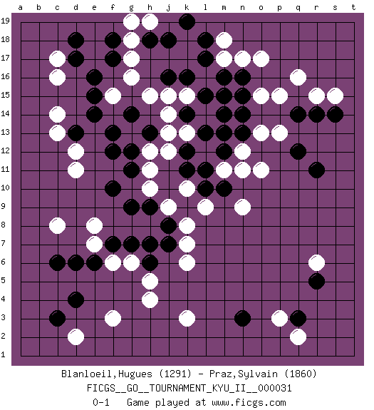 Last move : 0-1 2010 December 16 19:28:53 [Event "FICGS__GO__TOURNAMENT_KYU_II__000031"] [Site "FICGS"] [Date "2010.12.05"] [Round "1"] [Black "Blanloeil,Hugues"] [White "Praz,Sylvain"] [Result "0-1"] [Rating 1 "1291"] [Rating 2 "1860"] 1.d4 c16 2.q3 q16 3.r5 k3 4.n3 f3 5.c6 d2 6.c3 h4 7.r14 o17 8.r11 r15 9.q14 c8 10.e6 d11 11.e16 g16 12.e14 c14 13.d13 c13 14.d17 c17 15.j16 h15 16.l17 j15 17.k16 s15 18.s14 h12 19.f12 l14 20.n16 n17 21.m16 p15 22.n14 o13 23.n13 o15 24.n15 p13 25.q12 n12 26.m13 o11 27.l13 k13 28.k12 j13 29.l11 h10 30.g11 h11 31.f10 d12 32.f13 e8 33.g9 l9 34.h9 k10 35.m10 j9 36.g7 f6 37.f7 e7 38.d6 g6 39.h7 k6 40.h6 h5 41.j8 k8 42.j7 k7 43.d18 f15 44.e15 g18 45.f17 g17 46.f18 n9 47.j18 m18 48.k14 k15 49.l15 m17 50.l18 m14 51.h18 g19 52.k19 h19 53.m12 n11 54.h13 j12 55.k11 m11 56.l10 q2 57.g14 p3 58.m15 l14 59.m14 r6 60.g12 j14 0-1 Here are the names of the openings (joseki) played in the four corners : Corner d4 : d4 f3 Hoshi (Hwajeom, Seongjeom, Xingwei`) 4-4 Point. The star or hoshi (4-4) point, emphasizing influence at the potential expense of territory. Ikken Kakari (Hankan Keolch'im, Yi Gua`jiao~, 1-Space Low Approach). White 2 is the standard approach move to the 4-4. Corner q16 : q16 r14 Hoshi (Hwajeom, Seongjeom, Xingwei`) 4-4 Point. The star or hoshi (4-4) point, emphasizing influence at the potential expense of territory. Ikken Kakari (Hankan Keolch'im, Yi Gua`jiao~, 1-Space Low Approach). Black 2 is the standard approach move to the 4-4. Player White won this Go (weiqi, baduk) game. Follow this game move after move (download)Beware of the clumsy double contact. (Anonymous) Cactus - It is depressed cucumber. (Ilmars Cirulis)