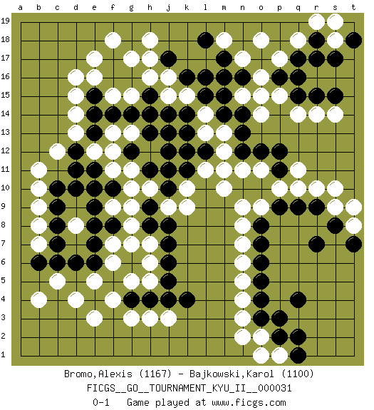 Last move : 0-1 2011 March 16 12:20:27 [Event "FICGS__GO__TOURNAMENT_KYU_II__000031"] [Site "FICGS"] [Date "2010.12.05"] [Round "1"] [Black "Bromo,Alexis"] [White "Bajkowski,Karol"] [Result "0-1"] [Rating 1 "1167"] [Rating 2 "1100"] 1.q16 d4 2.q4 d16 3.d10 c12 4.k4 g3 5.k16 r10 6.r7 q14 7.q15 r14 8.r15 e17 9.f17 g17 10.f16 f18 11.e13 d14 12.e14 d13 13.d11 h18 14.j17 h16 15.g16 h17 16.h15 j15 17.h14 k15 18.l16 j16 19.l15 n17 20.m17 n15 21.n16 o16 22.m16 p15 23.p16 p17 24.q17 o18 25.k14 l14 26.m14 l13 27.m15 q18 28.r18 o14 29.n14 o15 30.n13 m18 31.l18 r19 32.r17 s18 33.s17 s14 34.s15 l11 35.l12 m12 36.k12 m13 37.n12 n11 38.k13 m11 39.o12 q11 40.f5 e3 41.d6 h5 42.j5 g5 43.g6 h6 44.j6 h7 45.g7 b10 46.c10 b9 47.c9 c5 48.c6 g8 49.f8 f9 50.h8 g9 51.e9 f7 52.e8 f6 53.e7 f11 54.f10 g10 55.e10 h12 56.j14 n3 57.o3 n4 58.o4 n5 59.o5 n6 60.o6 e12 61.d12 f13 62.f14 g13 63.g14 b11 64.k11 b8 65.c8 o11 66.p12 k10 67.j11 j9 68.j10 k9 69.j8 n7 70.o7 n8 71.o8 b7 72.c7 d8 73.p11 p10 74.o10 o9 75.n10 m10 76.h9 h10 77.j7 j3 78.p9 n9 79.q9 q10 80.r9 o2 81.p2 n2 82.p3 p1 83.q1 o1 84.q2 s9 85.s8 s10 86.e6 f4 87.h13 j12 88.g12 f12 89.h11 g11 90.j13 t8 91.t7 t9 92.j4 h3 93.g12 h12 94.t18 s19 95.b6 b4 96.e15 d15 97.e11 e5 98.j12 g15 99.g12 g7 100.h4 e16 101.g4 f15 0-1 Here are the names of the openings (joseki) played in the four corners : Corner q16 : q16 q14 Hoshi (Hwajeom, Seongjeom, Xingwei`) 4-4 Point. The star or hoshi (4-4) point, emphasizing influence at the potential expense of territory. Ikken Takagakari (Hankan Nop'dakeolch'im, Yi Gaojia, 1-Space High Approach). Black typically responds at 6-4 or 3-10. Black 4-10 is played when Black finds play on the right side advantageous. Black 4-8 or 3-8 may be played when Black has support at top. Player White won this Go (weiqi, baduk) game. Follow this game move after move (download)There are players who don't accept exchange: they play many moves that perpetuate a previous state of the game. (Pierre Audouard) Perhaps the current trend of many chess professionals taking up the more lucrative pastime of poker is not a wholly negative one. It may not be too late for humans to relearn how to take risks in order to innovate and thereby maintain the advanced lifestyles we enjoy. And if it takes a poker-playing supercomputer to remind us that we can't enjoy the rewards without taking the risks, so be it. (The Chess Master and the Computer, by Garry Kasparov - 2010)