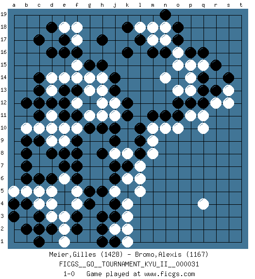 Last move : 1-0 2011 March 1 16:11:44 [Event "FICGS__GO__TOURNAMENT_KYU_II__000031"] [Site "FICGS"] [Date "2010.12.05"] [Round "1"] [Black "Meier,Gilles"] [White "Bromo,Alexis"] [Result "1-0"] [Rating 1 "1428"] [Rating 2 "1167"] 1.q16 d4 2.d16 q4 3.c6 c5 4.d6 d5 5.f3 q10 6.k16 k4 7.j3 k3 8.j4 j5 9.h5 h6 10.g5 g6 11.f6 d10 12.c13 c12 13.d12 d11 14.e12 g13 15.g15 n14 16.r13 r12 17.q12 q11 18.p12 o13 19.q14 p15 20.p16 o16 21.o17 n17 22.o18 n18 23.n16 o15 24.m16 m17 25.l17 l18 26.n19 m18 27.k18 q15 28.r15 s13 29.s14 s12 30.d2 c2 31.c3 b3 32.b2 c4 33.c1 d3 34.c2 e3 35.f2 e2 36.b6 e1 37.b4 b5 38.a3 a5 39.a4 f4 40.g4 f5 41.h3 j2 42.h2 k2 43.f7 e6 44.e7 d7 45.d8 c7 46.b7 c8 47.c9 d9 48.e8 e9 49.f9 g7 50.f8 c10 51.b9 b10 52.b12 f10 53.g10 g9 54.b8 g11 55.h10 h9 56.f11 h11 57.j10 j11 58.j9 j8 59.h8 g8 60.j6 h7 61.j7 k6 62.k5 l5 63.k7 l6 64.k11 k8 65.h8 j5 66.k12 j12 67.j13 h13 68.j14 h14 69.h15 f12 70.e11 d13 71.e13 d14 72.c14 e14 73.f13 f14 74.c11 e10 75.g12 g14 76.f16 l7 77.l8 m8 78.l9 m9 79.l10 m10 80.o11 p11 81.m11 n10 82.n11 o10 83.o12 p13 84.q13 p14 85.c17 f18 86.d18 e18 87.e17 f17 88.h17 h12 89.j1 k1 90.h1 f12 91.c12 f15 92.e16 1-0 Here are the names of the openings (joseki) played in the four corners : Corner d4 : d4 c6 Hoshi (Hwajeom, Seongjeom, Xingwei`) 4-4 Point. The star or hoshi (4-4) point, emphasizing influence at the potential expense of territory. Ikken Kakari (Hankan Keolch'im, Yi Gua`jiao~, 1-Space Low Approach). Black 2 is the standard approach move to the 4-4. Corner q16 : q16 n14 Hoshi (Hwajeom, Seongjeom, Xingwei`) 4-4 Point. The star or hoshi (4-4) point, emphasizing influence at the potential expense of territory. Player Black won this Go (weiqi, baduk) game. Follow this game move after move (download)To invade, need 20 points in open area; otherwise, keshi is best. (Yang Yilun, 7p) Unless in communicating with it one says exactly what one means, trouble is bound to result. (Alan Turing, about computers)
