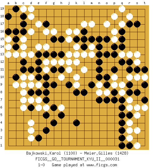Last move : 1-0 2011 January 18 13:47:40 [Event "FICGS__GO__TOURNAMENT_KYU_II__000031"] [Site "FICGS"] [Date "2010.12.05"] [Round "1"] [Black "Bajkowski,Karol"] [White "Meier,Gilles"] [Result "1-0"] [Rating 1 "1100"] [Rating 2 "1428"] 1.q16 d4 2.q4 d16 3.f3 c7 4.k4 d3 5.f5 r6 6.r8 r3 7.q3 r4 8.q5 o17 9.q14 l17 10.f17 f16 11.c17 e17 12.c16 c15 13.b15 c14 14.b14 b13 15.f7 r10 16.r12 p10 17.q6 r7 18.q7 q8 19.p8 q9 20.l8 r2 21.q2 o8 22.o7 n8 23.n7 q17 24.r17 r18 25.s17 p16 26.q15 e9 27.g9 f11 28.h11 d18 29.c18 d13 30.d6 c6 31.d8 d7 32.e8 e6 33.f9 f6 34.g6 e7 35.f8 c8 36.c12 c13 37.c9 d9 38.e10 d10 39.d11 c10 40.b10 b9 41.c11 c9 42.e11 f12 43.f10 h12 44.n13 k13 45.e2 d2 46.r1 s1 47.q1 s3 48.l14 k14 49.l16 k16 50.k15 j15 51.l15 m17 52.q18 p18 53.p17 g5 54.g4 q17 55.o9 p9 56.p7 n9 57.p17 h6 58.h5 q17 59.o10 q19 60.n10 k10 61.k11 l11 62.j12 k12 63.h13 j11 64.e12 g12 65.e13 e14 66.f13 f14 67.g13 j13 68.g11 j12 69.h15 j16 70.g15 g16 71.m9 h10 72.j9 k9 73.k8 l13 74.n15 p12 75.p13 o14 76.o15 p15 77.p14 o12 78.o13 m14 79.m15 m13 80.n14 a14 81.a16 s12 82.s11 s13 83.r11 r13 84.q12 q13 85.p11 o11 86.n11 s10 87.t11 t10 88.n12 c19 89.b19 a13 90.a18 a15 91.b16 d19 92.r5 s5 93.s8 t8 94.t7 t6 95.t9 s6 96.r9 1-0 Here are the names of the openings (joseki) played in the four corners : Corner d4 : d4 f3 Hoshi (Hwajeom, Seongjeom, Xingwei`) 4-4 Point. The star or hoshi (4-4) point, emphasizing influence at the potential expense of territory. Ikken Kakari (Hankan Keolch'im, Yi Gua`jiao~, 1-Space Low Approach). Black 2 is the standard approach move to the 4-4. Corner q4 : q4 r6 Hoshi (Hwajeom, Seongjeom, Xingwei`) 4-4 Point. The star or hoshi (4-4) point, emphasizing influence at the potential expense of territory. Ikken Kakari (Hankan Keolch'im, Yi Gua`jiao~, 1-Space Low Approach). White 2 is the standard approach move to the 4-4. Corner q16 : q16 o17 Hoshi (Hwajeom, Seongjeom, Xingwei`) 4-4 Point. The star or hoshi (4-4) point, emphasizing influence at the potential expense of territory. Ikken Kakari (Hankan Keolch'im, Yi Gua`jiao~, 1-Space Low Approach). White 2 is the standard approach move to the 4-4. Corner d16 : d16 f17 Hoshi (Hwajeom, Seongjeom, Xingwei`) 4-4 Point. The star or hoshi (4-4) point, emphasizing influence at the potential expense of territory. Ikken Kakari (Hankan Keolch'im, Yi Gua`jiao~, 1-Space Low Approach). Black 2 is the standard approach move to the 4-4. Player Black won this Go (weiqi, baduk) game. Follow this game move after move (download)Five groups might live but the six will die. (Anonymous) Industry executives and analysts often mistakenly talk about strategy as if it were some kind of chess match. But in chess, you have just two opponents, each with identical resources, and with luck playing a minimal role. The real world is much more like a poker game, with multiple players trying to make the best of whatever hand fortune has dealt them. In our industry, Bill Gates owns the table until someone proves otherwise. (David Moschella, 'Computerworld')