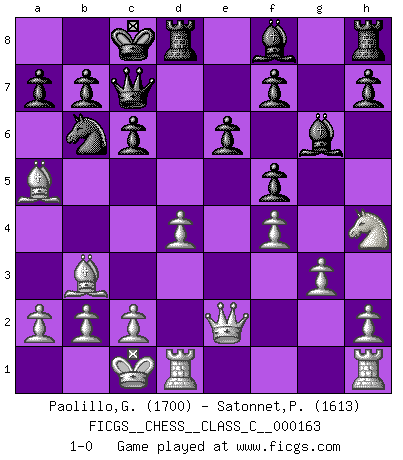 Last move : 1-0 2011 June 20 7:59:21 [Event "FICGS__CHESS__CLASS_C__000163"] [Site "FICGS"] [Date "2010.12.08"] [Round "1"] [White "Paolillo,Giampiero"] [Black "Satonnet,Patrick"] [Result "1-0"] [WhiteElo "1700"] [BlackElo "1613"] 1.e4 d5 2.exd5 Qxd5 3.Nc3 Qa5 4.d4 Nf6 5.Nf3 c6 6.Bc4 Bf5 7.Bd2 e6 8.Nd5 Qd8 9.Nxf6+ gxf6 10.Bb3 Nd7 11.Qe2 Qc7 12.Nh4 Bg6 13.O-O-O O-O-O 14.g3 Nb6 15.f4 f5 16.Ba5 1-0 This chess game has been lost on time (started : 2010.12.08 12:26:59) Scandinavian (centre counter) defense Queenside Castling by player White (move 13) Queenside Castling by player Black (move 13) Player White won this chess game. Follow this game move after move (download)With or without the title, Bobby Fischer was unquestionably the greatest player of his time. (Burt Hochberg) In der Schule lernt man nichts. Es ist nur Zeitverschwendung. (Robert James Fischer) Combinaciones deslumbrantes son para la mayoría, mover madera es para los pocos. (Georg Kieninger) Les échecs sont utiles à l'exercice de la faculté de penser et à celle de l'imagination. Car nous devons posséder une méthode élaborée pour atteindre des buts partout où nous devons conduire notre raison. (Leibnitz) The faster the computer, the slower the brain. (Thibault de Vassal)