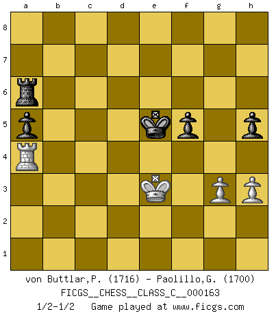 Last move : 1/2-1/2 2011 September 14 11:11:23 [Event "FICGS__CHESS__CLASS_C__000163"] [Site "FICGS"] [Date "2010.12.08"] [Round "1"] [White "von Buttlar,Paul"] [Black "Paolillo,Giampiero"] [Result "1/2-1/2"] [WhiteElo "1716"] [BlackElo "1700"] 1.c4 e5 2.Nc3 Bb4 3.Nd5 Bc5 4.e3 c6 5.Nc3 Nf6 6.d4 exd4 7.exd4 Bb4 8.Bd3 d5 9.a3 dxc4 10.Bxc4 Be7 11.Nf3 O-O 12.O-O Bg4 13.Be3 Nbd7 14.d5 Bxf3 15.Qxf3 Ne5 16.Qe2 Nxc4 17.Qxc4 Nxd5 18.Nxd5 Qxd5 19.Qxd5 cxd5 20.Rad1 Rfd8 21.Rd3 Bf6 22.Rfd1 Bxb2 23.Rb3 Bf6 24.Rxb7 d4 25.Bf4 a6 26.h3 g5 27.Bd2 Rdb8 28.Rd7 Kg7 29.f4 gxf4 30.Bxf4 Rb3 31.Rd6 Rxa3 32.Bh6+ Kxh6 33.Rxf6+ Kg7 34.Rd6 d3 35.R1xd3 Rxd3 36.Rxd3 a5 37.Ra3 f5 38.Ra4 Kf6 39.Kf2 h6 40.Kf3 Ke5 41.Ke3 Kd5 42.Kf4 Ke6 43.g3 Ra7 44.Ke3 Ke5 45.Kf3 Ra8 46.Ke3 h5 47.Kf3 Kf6 48.Kf4 Ra6 49.Kf3 Ke5 50.Ke3 Ra7 51.Kf3 Ra8 52.Ke3 Ra6 1/2-1/2 English, Kramnik-Shirov counterattack Kingside Castling by player Black (move 11) Kingside Castling by player White (move 12) 10 pieces endgame at move 35 : White KRPP , Black KRRPPP WHITE : King + 1 Rook 2 Pawns BLACK : King + 2 Rooks 3 Pawns 9 pieces endgame at move 36 : White KRPP , Black KRPPP WHITE : King + 1 Rook 2 Pawns BLACK : King + 1 Rook 3 Pawns This chess game ended in a draw. Follow this game move after move (download)Those who say they understand Chess, understand nothing. (Robert Hubner) Das ganze Leben mit einer Ehefrau ist wie ein Endspiel mit ungleichfarbigen Läufern. (Viktor Kortschnoi) Tu no necesitas jugar muy bien, únicamente ayudar a tu oponenet a que juegue muy mal. (Genrikh Chepukaitis) Avant la finale, les dieux ont créé le milieu de partie. (Tarrasch) No, no, you're not thinking; you're just being logical. (Niels Bohr)
