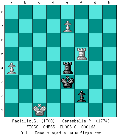 Last move : 0-1 2011 September 15 18:35:53 [Event "FICGS__CHESS__CLASS_C__000163"] [Site "FICGS"] [Date "2010.12.08"] [Round "1"] [White "Paolillo,Giampiero"] [Black "Gensabella,Paolo"] [Result "0-1"] [WhiteElo "1700"] [BlackElo "1774"] 1.e4 e5 2.Nf3 Nc6 3.Bc4 Nf6 4.Ng5 d5 5.exd5 Na5 6.Bb5+ c6 7.dxc6 bxc6 8.Be2 Be7 9.d3 O-O 10.O-O h6 11.Nf3 Qc7 12.Nc3 Rd8 13.Qe1 Rb8 14.Bd1 Bd6 15.Ne4 Nxe4 16.Qxe4 c5 17.b3 Nc6 18.Re1 Nd4 19.c3 Bb7 20.Qg4 e4 21.dxe4 Nxf3+ 22.Bxf3 Bxh2+ 23.Kh1 Be5 24.Rb1 Bc8 25.Qh4 Be6 26.Bg4 Bxg4 27.Qxg4 Bxc3 28.Bf4 Qc8 29.Qxc8 Rbxc8 30.Re2 g5 31.Rc1 Bd4 32.Bd2 Kg7 33.g4 Kg6 34.Kg2 h5 35.gxh5+ Kxh5 36.Bc3 Re8 37.f3 Kg6 38.Bxd4 cxd4 39.Rd1 Red8 40.Red2 f5 41.a4 f4 42.Rxd4 Rc2+ 43.Kf1 Rxd4 44.Rxd4 Rc3 45.Kf2 Rxb3 46.Rd7 Rb2+ 47.Ke1 Rb3 48.Ke2 a6 49.Rd6+ Kh5 50.Rxa6 Rb2+ 51.Ke1 Kh4 52.Ra5 Kg3 53.Rxg5+ Kxf3 54.e5 Ke3 55.Kd1 f3 56.e6 f2 57.Rf5 Rd2+ 58.Kc1 Rd4 59.e7 Re4 0-1 Two knights defense Kingside Castling by player Black (move 9) Kingside Castling by player White (move 10) 10 pieces endgame at move 45 : White KRPPP , Black KRPPP WHITE : King + 1 Rook 3 Pawns BLACK : King + 1 Rook 3 Pawns 9 pieces endgame at move 50 : White KRPPP , Black KRPP WHITE : King + 1 Rook 3 Pawns BLACK : King + 1 Rook 2 Pawns 8 pieces endgame at move 53 : White KRPPP , Black KRP WHITE : King + 1 Rook 3 Pawns BLACK : King + 1 Rook 1 Pawn 7 pieces endgame at move 53 : White KRPP , Black KRP WHITE : King + 1 Rook 2 Pawns BLACK : King + 1 Rook 1 Pawn Player Black won this chess game. Follow this game move after move (download)Strategy requires thought, tactics require observation. (Max Euwe) Es liegt in der Natur, vernüftig zu denken und unlogisch zu handeln. (Anatole France) El Ajedrez es parte de una cultura y si una cultura esta en decadencia, entonces también el Ajedrez declinará. (Mikhail Botvinnik) Seul un grand joueur sait à quel point il joue faiblement. (Xavier Tartacover) Players are not good because they find tactics, it is about the way to find the positions in which those tactics are hidden. (Luc-Olivier Leclerc)