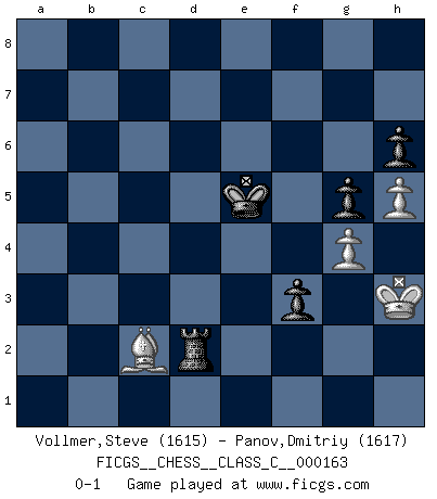 Last move : 0-1 2011 April 16 23:49:16 [Event "FICGS__CHESS__CLASS_C__000163"] [Site "FICGS"] [Date "2010.12.08"] [Round "1"] [White "Vollmer,Steve"] [Black "Panov,Dmitriy"] [Result "0-1"] [WhiteElo "1615"] [BlackElo "1617"] 1.Nf3 Nf6 2.g3 d5 3.Bg2 e6 4.O-O Be7 5.d4 O-O 6.Nc3 c5 7.Be3 cxd4 8.Bxd4 Nc6 9.e3 h6 10.Qe2 Nd7 11.Nd1 e5 12.Bc3 Qc7 13.e4 d4 14.Bd2 a5 15.Ne1 b6 16.f4 Ba6 17.Nd3 Nb4 18.Bxb4 axb4 19.N1f2 Bb5 20.Qd2 Ra4 21.Rfd1 Rfa8 22.fxe5 Nxe5 23.Nxe5 Qxe5 24.Qxd4 Qxd4 25.Rxd4 Bc5 26.R4d1 Rxa2 27.Rab1 Rc8 28.e5 Bxf2+ 29.Kxf2 Rxc2+ 30.Kg1 g6 31.Rd8+ Kg7 32.Bd5 Raxb2 33.Rxb2 Rxb2 34.Rb8 Rb1+ 35.Kf2 b3 36.Rxb6 Rf1+ 37.Ke3 b2 38.Rxb5 b1Q 39.Rxb1 Rxb1 40.h4 Kf8 41.Kf4 Ke7 42.Ba2 Rb2 43.Bd5 Rb4+ 44.Kf3 Rd4 45.Ba2 Rd3+ 46.Kg4 Rd2 47.Bb1 Ke6 48.h5 g5 49.Kh3 Kxe5 50.Bh7 f5 51.g4 f4 52.Bc2 f3 0-1 Reti Opening Kingside Castling by player White (move 4) Kingside Castling by player Black (move 5) Promotion Queen by player Black (move 38) 10 pieces endgame at move 39 : White KBPPP , Black KRPPP WHITE : King + 1 Bishop 3 Pawns BLACK : King + 1 Rook 3 Pawns 9 pieces endgame at move 49 : White KBPP , Black KRPPP WHITE : King + 1 Bishop 2 Pawns BLACK : King + 1 Rook 3 Pawns Player Black won this chess game. Follow this game move after move (download)Bobby Fischer is the greatest Chess player who has ever lived. (Ken Smith) Der Partner hat auch seine Existenzberechtigung. (Savielly Grigorievitsch Tartakower) Mi estilo es algo parecido entre un poco de Tal y Petrosian. (Reshevsky) Ne tendez aucun piège pour le plaisir ! Ne jouez rien dans l'espoir que l'adversaire réagisse de façon stupide ! Prenez toujours pour acquis que l'adversaire va trouver le meilleur coup ! Ne jouez jamais de coup dans l'espoir que l'adversaire ne voie pas la menace ! Chacun de vos coups doit améliorer la position d'une façon ou d'une autre. There are three kinds of lies: lies, damned lies and statistics. (Mark Twain)