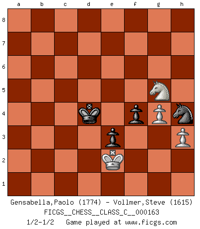 Last move : 1/2-1/2 2011 January 19 14:21:15 [Event "FICGS__CHESS__CLASS_C__000163"] [Site "FICGS"] [Date "2010.12.08"] [Round "1"] [White "Gensabella,Paolo"] [Black "Vollmer,Steve"] [Result "1/2-1/2"] [WhiteElo "1774"] [BlackElo "1615"] 1.d4 d5 2.c4 e6 3.Nc3 Nf6 4.e3 Be7 5.Nf3 O-O 6.Bd3 Nbd7 7.O-O a6 8.e4 dxe4 9.Nxe4 Nxe4 10.Bxe4 Nf6 11.Bd3 c5 12.dxc5 Bxc5 13.Qc2 h6 14.Bd2 Qc7 15.b4 Be7 16.Bc3 Bd7 17.Rfe1 Bc6 18.Ne5 Rac8 19.Rac1 Rfd8 20.a4 Be8 21.h3 Nd7 22.c5 Nf6 23.Nc4 Bxa4 24.Qxa4 Rxd3 25.Be5 Qc6 26.Qxc6 bxc6 27.Nb6 Rcd8 28.Ra1 Rb3 29.Rxa6 Rxb4 30.Bc7 Rd3 31.Nc8 Bxc5 32.Rxc6 Rc4 33.Bb6 Rdc3 34.Bxc5 Rxc5 35.Rxc5 Rxc5 36.Nb6 g5 37.Rd1 Rc7 38.Kf1 Kg7 39.Rd4 Rb7 40.Nc8 Nd5 41.Rd1 Nc3 42.Rc1 Rb1 43.Rxb1 Nxb1 44.Nd6 Nc3 45.Ke1 Kg6 46.Kd2 Nd5 47.Ke2 f5 48.g3 h5 49.Kf3 h4 50.Ke2 hxg3 51.fxg3 e5 52.Kd3 Ne7 53.Ke3 Kf6 54.g4 Ke6 55.Nb7 Kd5 56.Nd8 f4+ 57.Kf2 Ng6 58.Nf7 Nh4 59.Nxg5 e4 60.Ke2 e3 61.Kd3 Ke5 62.Ke2 Kd4 1/2-1/2 QGD : 3...Nf6 Kingside Castling by player Black (move 5) Kingside Castling by player White (move 7) 10 pieces endgame at move 50 : White KNPP , Black KNPPPP WHITE : King + 1 Knight 2 Pawns BLACK : King + 1 Knight 4 Pawns 9 pieces endgame at move 51 : White KNPP , Black KNPPP WHITE : King + 1 Knight 2 Pawns BLACK : King + 1 Knight 3 Pawns 8 pieces endgame at move 59 : White KNPP , Black KNPP WHITE : King + 1 Knight 2 Pawns BLACK : King + 1 Knight 2 Pawns This chess game ended in a draw. Follow this game move after move (download)I believe that Chess possesses a magic that is also a help in advanced age. A rheumatic knee is forgotten during a game of Chess and other events can seem quite unimportant in comparison with a catastrophe on the chessboard. (Vlastimil Hort) Frage: Was machen Sie mit den Preisen? Anwort: Ich habe Angst, dass meine Freundin davon neue Kleider kauft. (Loek van Wely) Bobby es el jugador de Ajedrez mas fino que este país jamás haya producido. Su memoria para las movidas, su brillantez en soñar combinaciones y su feróz determinación por la victoria son algo extraño. (John Collins) 'L'échange des dames est un coup dur pour les deux adversaires...' Un journaliste lors d'une partie du match Spassky-Fischer Depression is just anger without enthusiasm. (Unknown)