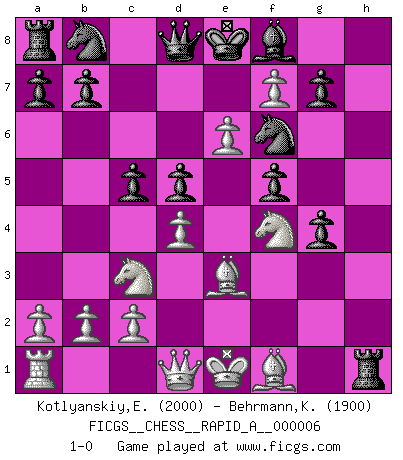 Last move : 1-0 2006 December 12 3:44:32 [Event "FICGS__CHESS__RAPID_A__000006"] [Site "FICGS"] [Date "2006.12.03"] [Round "1"] [White "Kotlyanskiy,Edward"] [Black "Behrmann,Klaus"] [Result "1-0"] [WhiteElo "2000"] [BlackElo "1900"] 1.e4 c6 2.d4 d5 3.e5 Bf5 4.Nc3 e6 5.g4 Bg6 6.Nge2 c5 7.Be3 Nd7 8.h4 h6 9.f4 h5 10.f5 exf5 11.Nf4 hxg4 12.e6 Nb8 13.h5 Nf6 14.hxg6 Rxh1 15.gxf7+ 1-0 Caro-Kann : Advance variation Player White won this chess game. Follow this game move after move (download)I have never in my life played the French Defence, which is the dullest of all openings. (Wilhelm Steinitz) Kann Schach nicht schließlich das Nationalspiel der Deutschen werden? Und welche weiteren Ausblicke bieten sich dann dar! Welche Hebung des allgemeinen Kultur-Niveaus, ja der Moral, wenn das Schachbrett den Kartentisch verdrängen würde! Wahrlich, ein Ziel, des Schweißes der Edlen wert! (Siegbert Tarrasch) El Ajedrez era la lengua materna de Capablanca. (Reti) A chaque perte on perd un peu de soi. (Joël Lautier) They misunderestimated me. (George W. Bush, Bentonville nov. 6, 2000)