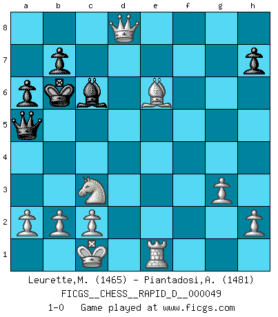 Last move : 1-0 2011 January 9 23:38:23 [Event "FICGS__CHESS__RAPID_D__000049"] [Site "FICGS"] [Date "2010.12.08"] [Round "1"] [White "Leurette,Marc-Antoine"] [Black "Piantadosi,Angelo"] [Result "1-0"] [WhiteElo "1465"] [BlackElo "1481"] 1.e4 c5 2.Nf3 Nc6 3.Nc3 d6 4.d4 cxd4 5.Nxd4 Nf6 6.Bg5 e6 7.Qe2 Be7 8.O-O-O Nxd4 9.Rxd4 a6 10.e5 Qb6 11.exf6 Bxf6 12.Bxf6 gxf6 13.Qd3 d5 14.f4 Bd7 15.g3 Rc8 16.f5 Bc6 17.fxe6 fxe6 18.Bh3 Rd8 19.Bxe6 Rd6 20.Re1 Kd8 21.Nxd5 Qa5 22.Nc3 Rxd4 23.Qxd4+ Kc7 24.Qf4+ Kb6 25.Qxf6 Rd8 26.Qxd8+ 1-0 Sicilian defense Queenside Castling by player White (move 8) Player White won this chess game. Follow this game move after move (download)Chess is 99 percent tactics. (Teichmann) Dieses schreckliche Gefühl, dass ich gegen eine Maschine spielte, die niemals Fehler macht, zerschmetterte meinen Widerstand. (Mark Taimanov) Evita las multitudes. Haz independientemente tu propio razonamiento. Trata de ser el jugador de Ajedrez, no la pieza de Ajedrez. (Ralph Charell) Je menace de comprendre la position. (Anonyme) There is no instance of a country having benefited from prolonged warfare. (Sun Tzu)