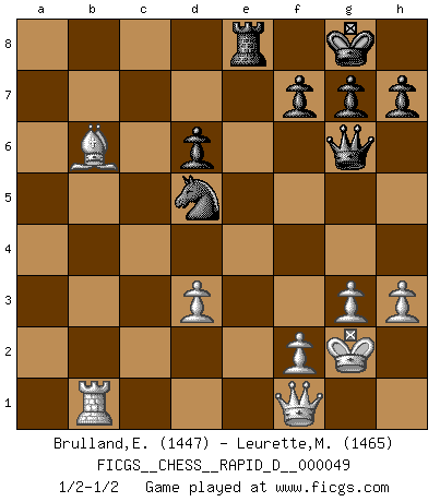 Last move : 1/2-1/2 2011 January 11 8:43:16 [Event "FICGS__CHESS__RAPID_D__000049"] [Site "FICGS"] [Date "2010.12.08"] [Round "1"] [White "Brulland,Emmanuel"] [Black "Leurette,Marc-Antoine"] [Result "1/2-1/2"] [WhiteElo "1447"] [BlackElo "1465"] 1.b3 d5 2.e3 Nf6 3.Bb2 Bf5 4.d3 e6 5.Ne2 Nc6 6.Nd2 Bd6 7.g3 O-O 8.Bg2 e5 9.O-O a5 10.a3 Qd7 11.Re1 Bh3 12.Nc3 Bxg2 13.Kxg2 d4 14.exd4 exd4 15.Ne2 Rfe8 16.Nxd4 Nxd4 17.Bxd4 Rxe1 18.Qxe1 Re8 19.Qf1 Qc6+ 20.Kg1 Qxc2 21.Nc4 Nd5 22.Nxa5 b6 23.Nc4 Qxb3 24.Nxd6 cxd6 25.Rb1 Qxa3 26.Bxb6 Qc3 27.Rc1 Qb4 28.Rb1 Qg4 29.h3 Qg6 30.Kh2 Qf6 31.Kg2 Qg6 32.Kh2 Qf6 33.Kg2 Qg6 1/2-1/2 Nimzovich-Larsen attack : Classical variation Kingside Castling by player Black (move 7) Kingside Castling by player White (move 9) This chess game ended in a draw. Follow this game move after move (download)In complicated positions, Bobby Fischer hardly had to be afraid of anybody. (Paul Keres) Schach ist das Spiel, das die Verrückten gesund hält. (Albert Einstein) Los finales de Peón son del Ajedrez lo que el cesped es del Golf. (Cecil Purdy) Les écrivains ont utilisé les échecs pour analyser les côtés extrêmes de la nature humaine. Dans ce cadre, les échecs offrent un champ d'expérimentation idéal. Mais on pourrait faire la même chose avec la peinture. Et là, en vous référant à Van Gogh, vous ne tirerez pas de conclusion définitive sur les peintres. (Gary Kasparov) Your best chance to get a Royal Flush in a casino is in the bathroom. (Anonymous)