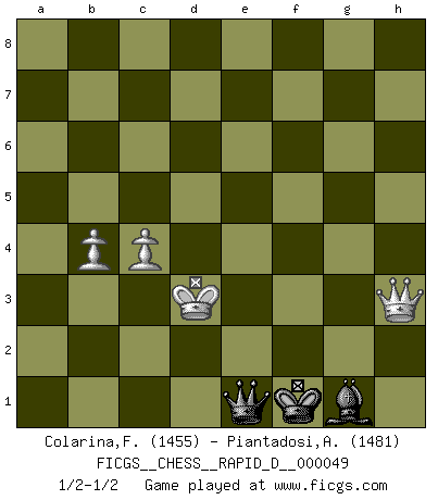 Last move : 1/2-1/2 2011 April 9 3:41:47 [Event "FICGS__CHESS__RAPID_D__000049"] [Site "FICGS"] [Date "2010.12.08"] [Round "1"] [White "Colarina,Floram"] [Black "Piantadosi,Angelo"] [Result "1/2-1/2"] [WhiteElo "1455"] [BlackElo "1481"] 1.c4 e5 2.Nc3 Nf6 3.Nf3 d6 4.d4 exd4 5.Nxd4 Nc6 6.Nxc6 bxc6 7.Bg5 Be7 8.g3 O-O 9.Bg2 Bd7 10.O-O Re8 11.e4 h6 12.Bf4 Bf8 13.Qc2 c5 14.e5 dxe5 15.Bxa8 Qxa8 16.Be3 Bh3 17.f3 Bxf1 18.Rxf1 Rd8 19.Kf2 Bd6 20.Ne4 Nxe4+ 21.Qxe4 Qxe4 22.fxe4 Be7 23.Ke2 f6 24.Rd1 Rxd1 25.Kxd1 Kf7 26.Kc2 Ke6 27.g4 g6 28.h4 h5 29.gxh5 gxh5 30.Kb3 f5 31.exf5+ Kxf5 32.Kc2 Bxh4 33.Bxc5 e4 34.Bxa7 Bg3 35.Be3 h4 36.a4 h3 37.Bg1 h2 38.Bxh2 Bxh2 39.b4 e3 40.Kd3 Kf4 41.a5 Kf3 42.a6 e2 43.a7 e1Q 44.a8Q+ Kg3 45.Qg8+ Kf3 46.Qd5+ Kg4 47.Qd7+ Kh4 48.Qh7+ Kg3 49.Qxc7+ Kg2 50.Qc6+ Kf1 51.Qh1+ Bg1 52.Qh3+ Kf2 53.Qh4+ Kf1 54.Qh3+ 1/2-1/2 English Opening Kingside Castling by player Black (move 8) Kingside Castling by player White (move 10) 10 pieces endgame at move 34 : White KBPPP , Black KBPPP WHITE : King + 1 Bishop 3 Pawns BLACK : King + 1 Bishop 3 Pawns 9 pieces endgame at move 38 : White KBPPP , Black KBPP WHITE : King + 1 Bishop 3 Pawns BLACK : King + 1 Bishop 2 Pawns 8 pieces endgame at move 38 : White KPPP , Black KBPP WHITE : King + 3 Pawns BLACK : King + 1 Bishop 2 Pawns Promotion Queen by player Black (move 43) Promotion Queen by player White (move 44) 7 pieces endgame at move 49 : White KQPP , Black KQB WHITE : King + 1 Queen 2 Pawns BLACK : King + 1 Queen 1 Bishop This chess game ended in a draw. Follow this game move after move (download)War is the child of passion, passion is the child of narcissism and narcissism is the child. (...) Another game ? (Thibault de Vassal) Die Elozahlen sind sehr schlecht für das Schach. Jetzt ist Schach eine Sportindustrie, die darauf zielt Elopunkte zu machen. (Miguel Najdorf) No soy una persona materialista y por eso, no resiento la falta o pérdida del dinero. La ausencia de cosas mundanas carece de importancia. Ya que el Ajedrez es una forma en la que puedo ser tan materialista como yo desee sin tener la necesidad de vender mi alma. (Jamie Walter Adams) Pour se monter efficace, un Cavalier a besoin d'avant-postes ! Les Cavaliers font les meilleurs bloqueurs de pions passés. Once you start thinking you have nothing left to learn, you have everything to learn. (Steve Badget)