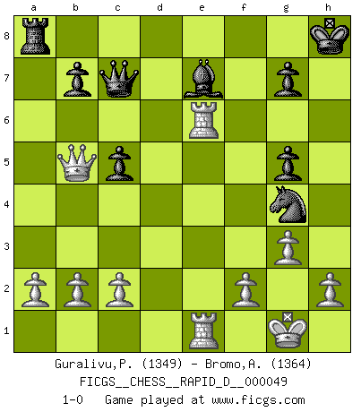 Last move : 1-0 2011 January 19 14:26:37 [Event "FICGS__CHESS__RAPID_D__000049"] [Site "FICGS"] [Date "2010.12.08"] [Round "1"] [White "Guralivu,Paul-Iosif"] [Black "Bromo,Alexis"] [Result "1-0"] [WhiteElo "1349"] [BlackElo "1364"] 1.e4 c5 2.Nf3 Nc6 3.d4 d6 4.Bb5 Bd7 5.O-O a6 6.Bxc6 Bxc6 7.Nc3 Nf6 8.d5 Bb5 9.Re1 e5 10.dxe6 fxe6 11.Bg5 Be7 12.Nxb5 axb5 13.Qe2 h6 14.e5 dxe5 15.Nxe5 hxg5 16.Qxb5+ Kf8 17.Ng6+ Kg8 18.Nxh8 Kxh8 19.Rxe6 Qc7 20.Rae1 Ng4 21.g3 1-0 Sicilian defense Kingside Castling by player White (move 5) Player White won this chess game. Follow this game move after move (download)A sacrifice is best refuted by accepting it. (Wilhelm Steinitz) Der Umstand, daß uns eine 7 Stunden Zeitkontrolle ermöglicht eine großartige, tiefe Partie zu spielen, ist für die Massenmedien nicht weiter von Bedeutung. (Alexej Shirov) Al jugar al Ajedrez entonces, podemos aprender: Primero: Previsión... Segundo: Prudencia... Tercero: Cautela... Y al final, aprendemos del Ajedrez el hábito de no ser desanimados por apariencias malas presentes en el estado de nuestros asuntos, el hábito de la esperanza por una oportunidad favorable y la perseveración de los secretos de los recursos. (Benjamin Franklin) Dans le domaine de la peinture, de la gravure et de la sculpture, dès la première décennie de notre siècle, les artistes abandonnent la représentation de la partie d'échecs pour se concentrer sur les pièces, sur les échiquiers et sur toutes les variations auxquelles les unes et les autres peuvent donner lieu. On passe en quelque sorte d'un thème social à un thème musical (au sens de la musica médiévale, c'est-à-dire d'une notion qui inclue le rythme, l'harmonie, la construction et la déconstruction, etc.). Graphiquement et picturalement, l'échiquier apparaît comme une structure ouverte, dynamique, d'une richesse infinie, autorisant toutes les combinatoires et débouchant sur des mouvements et des rythmes de nature exponentielle. (Michel Pastoureau) In God we trust, all others we virus scan. (Anonymous)