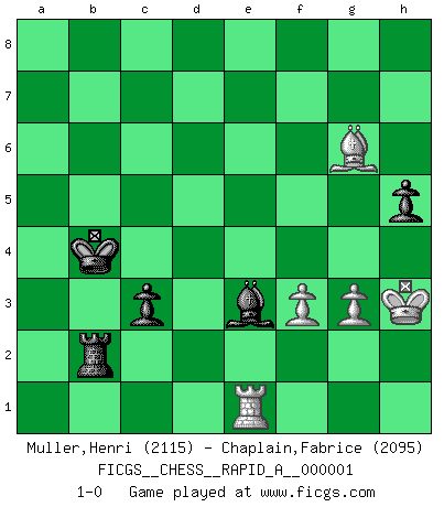 Last move : 1-0 2006 July 28 15:7:35 [Event "FICGS__CHESS__RAPID_A__000001"] [Site "FICGS"] [Date "2006.04.30"] [Round "1"] [White "Muller,Henri"] [Black "Chaplain,Fabrice"] [Result "1-0"] [WhiteElo "2115"] [BlackElo "2095"] 1.e4 c5 2.Nf3 Nc6 3.d4 cxd4 4.Nxd4 Nf6 5.Nc3 e5 6.Ndb5 d6 7.Bg5 a6 8.Na3 b5 9.Bxf6 gxf6 10.Nd5 f5 11.Bd3 Be6 12.O-O Bxd5 13.exd5 Ne7 14.c3 Bg7 15.Qh5 e4 16.Bc2 O-O 17.Rae1 Qc8 18.Bb3 a5 19.Nxb5 a4 20.Bd1 Qc5 21.Nd4 Qxd5 22.Qg5 Qe5 23.f3 f4 24.Qxe5 dxe5 25.Rxe4 Rfb8 26.b4 exd4 27.Rxe7 dxc3 28.a3 Bd4+ 29.Kh1 Rd8 30.Rc7 Rac8 31.Rxc8 Rxc8 32.Bc2 Re8 33.Bd1 Kg7 34.g3 fxg3 35.hxg3 h5 36.b5 Bb6 37.Bxa4 Ra8 38.Bc2 Rxa3 39.Be4 Kf6 40.Rd1 Ke7 41.Kg2 Ra2+ 42.Kh3 Rb2 43.Bd3 Kd6 44.Bc4 Kc5 45.Bxf7 Kxb5 46.Bg6 Kc4 47.Bf7+ Kb4 48.Bg6 Be3 49.Re1 1-0 This chess game has been lost on time (started : 2006.04.30 20:27:54) Sicilian : Pelikan (Lasker/Sveshnikov) variation Kingside Castling by player White (move 12) Kingside Castling by player Black (move 16) 10 pieces endgame at move 45 : White KRBPP , Black KRBPP WHITE : King + 1 Rook 1 Bishop 2 Pawns BLACK : King + 1 Rook 1 Bishop 2 Pawns Player White won this chess game. Follow this game move after move (download)Chess demands total concentration. (Bobby Fischer) Schach ist eine Sache der genauen Beurteilung, wann man zuschlagen und wann man sich ducken muss. (Robert James Fischer) Una partida de Ajedrez se divide en 3 etapas: la primera cuando piensas que tienes la ventaja, la segunda cuando crees que tienes la ventaja y la tercera... ¡cuando te das cuenta que vas a perder!. (Savielly Tartakower) Karpov est une pièce de musée. (Garry Kasparov) Fame, I have already. Now I need the money. (an elderly Steinitz)