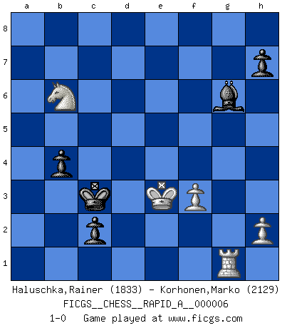 Last move : 1-0 2007 June 29 9:48:57 [Event "FICGS__CHESS__RAPID_A__000006"] [Site "FICGS"] [Date "2006.12.03"] [Round "1"] [White "Haluschka,Rainer"] [Black "Korhonen,Marko"] [Result "1-0"] [WhiteElo "1833"] [BlackElo "2129"] 1.d4 Nf6 2.c4 g6 3.Nc3 d5 4.cxd5 Nxd5 5.e4 Nxc3 6.bxc3 Bg7 7.Ba3 Nd7 8.Nf3 c5 9.Qb3 O-O 10.Bd3 Rb8 11.O-O b5 12.Qc2 a6 13.Bc1 e5 14.a4 exd4 15.cxd4 c4 16.Be2 Bb7 17.Bf4 Re8 18.e5 Nf8 19.Be3 Ne6 20.Qb2 Bd5 21.Rfc1 Qc7 22.Nd2 Qc6 23.g3 f5 24.Qb4 f4 25.gxf4 Bh6 26.axb5 axb5 27.Rc3 Nxf4 28.Bxf4 Bxf4 29.Nf1 Rf8 30.Rb1 g5 31.Rd1 g4 32.Ng3 Qg6 33.Qc5 Qf7 34.Rf1 Rfc8 35.Qb4 Bd2 36.Bxg4 Bxc3 37.Qxc3 b4 38.Qe3 Rc6 39.Bh5 Qd7 40.f3 c3 41.Bg4 Qe7 42.Nf5 Qd8 43.Nh6+ Kh8 44.e6 Qf6 45.Nf7+ Kg7 46.Ne5 Rxe6 47.Bxe6 Bxe6 48.Kh1 Bf5 49.Rg1+ Bg6 50.Ng4 Qf5 51.Qh6+ Kg8 52.Qe3 Kh8 53.d5 Rb7 54.d6 Qd3 55.Qe5+ Rg7 56.Qf6 Qf5 57.d7 Qxd7 58.Qf8+ Rg8 59.Qxg8+ Kxg8 60.Nf6+ Kf7 61.Nxd7 Ke7 62.Nb6 Kd6 63.Kg2 Kc5 64.Na4+ Kc4 65.Kf2 Kb3 66.Nb6 c2 67.Ke2 Kc3 68.Ke3 1-0 King's Indian defense, 3.Nc3 Kingside Castling by player Black (move 9) Kingside Castling by player White (move 11) 10 pieces endgame at move 61 : White KRNPP , Black KBPPP WHITE : King + 1 Rook 1 Knight 2 Pawns BLACK : King + 1 Bishop 3 Pawns Player White won this chess game. Follow this game move after move (download)Bobby is the finest Chess player this country ever produced. His memory for the moves, his brilliance in dreaming up combinations, and his fierce determination to win are uncanny. (John Collins) Nur ein wirklich starker Spieler weiß wie schwach er spielt. (Savielly Grigorievitsch Tartakower) Cuando estes solo, cuando te sientas un extraño en el mundo, juega al Ajedrez. Esto levantará tu espiritu y será tu consejero de guerra. (Aristóteles) Plusieurs personnes se sont demandées comment Tal faisait pour gagner... En fait, c'est très simple ! Il met ses pièces au centre de l'échiquier et les sacrifie quelque part ! (David Bronstein) Live, lose, and learn, by observing your opponent how to win. (Amber Steenbock)