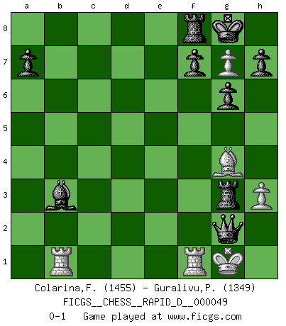 Last move : 0-1 2010 December 29 15:53:46 [Event "FICGS__CHESS__RAPID_D__000049"] [Site "FICGS"] [Date "2010.12.08"] [Round "1"] [White "Colarina,Floram"] [Black "Guralivu,Paul-Iosif"] [Result "0-1"] [WhiteElo "1455"] [BlackElo "1349"] 1.e4 c5 2.Nf3 d6 3.d4 cxd4 4.Nxd4 Nf6 5.Bd3 Nc6 6.Nxc6 bxc6 7.O-O e5 8.c4 Be7 9.Nc3 O-O 10.h3 Bb7 11.Be3 d5 12.cxd5 cxd5 13.exd5 Nxd5 14.Nxd5 Bxd5 15.Qh5 g6 16.Qxe5 Bf6 17.Qg3 Bxb2 18.Rab1 Bg7 19.Rbd1 Qa5 20.f4 Bxa2 21.f5 Bb3 22.Rb1 Qd5 23.Be2 Rae8 24.Bg4 Rxe3 25.f6 Rxg3 26.fxg7 Qxg2+ 0-1 Sicilian Kingside Castling by player White (move 7) Kingside Castling by player Black (move 9) Player Black won this chess game. Follow this game move after move (download)By this measure (on the gap between Fischer & his contemporaries), I consider him the greatest world champion. (Garry Kasparov) Ich verstehe Aljechins Kombinationen ganz gut; aber woher er diese Angriffschancen bekommt und wie er die Eröffnung behandelt das ist für mich ein Buch mit sieben Siegeln. (Rudolf Spielmann) Evita las multitudes. Haz independientemente tu propio razonamiento. Trata de ser el jugador de Ajedrez, no la pieza de Ajedrez. (Ralph Charell) À la honte des hommes, on sait que les lois du jeu sont les seules qui soient partout justes, claires, inviolables et exécutées. Pourquoi l'Indien qui a donné les règles du jeu d'échecs est-il obéi de bon gré dans toute la terre, et que les décrétales des papes, par exemple, sont aujourd'hui un objet d'horreur et de mépris ? C'est que l'inventeur des échecs combina tout avec justesse pour la satisfaction des joueurs, et que les papes, dans leurs décrétales, n'eurent en vue que leur seul avantage. L'Indien voulut exercer également l'esprit des hommes et leur donner du plaisir; les papes ont voulu abrutir l'esprit des hommes. Voltaire (Dictionnaire philosophique / Garnier 1967) The age of a woman doesn't mean a thing. The best tunes are played on the oldest fiddles. (Ralph Waldo Emerson)