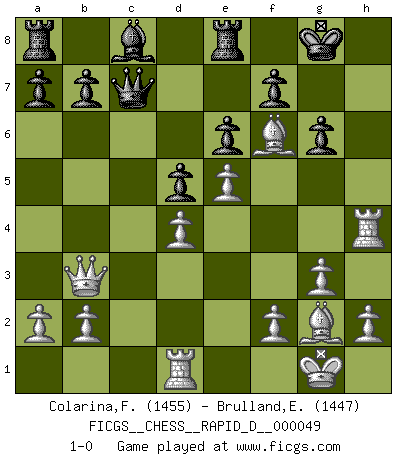 Last move : 1-0 2011 February 3 17:50:34 [Event "FICGS__CHESS__RAPID_D__000049"] [Site "FICGS"] [Date "2010.12.08"] [Round "1"] [White "Colarina,Floram"] [Black "Brulland,Emmanuel"] [Result "1-0"] [WhiteElo "1455"] [BlackElo "1447"] 1.d4 d5 2.c4 c6 3.g3 e6 4.Nc3 Nf6 5.Bg2 Be7 6.Nf3 O-O 7.O-O Re8 8.Qb3 Nbd7 9.Re1 dxc4 10.Qxc4 Nb6 11.Qb3 h6 12.e4 Bf8 13.Bf4 g6 14.Rad1 Bg7 15.Ne5 Nfd7 16.Ng4 Nf6 17.Nxh6+ Bxh6 18.Bxh6 Kh7 19.Bg5 Kg7 20.e5 Kg8 21.Bxf6 Qc7 22.Re4 Nd5 23.Nxd5 cxd5 24.Rh4 1-0 QGD Slav defense Kingside Castling by player Black (move 6) Kingside Castling by player White (move 7) Player White won this chess game. Follow this game move after move (download)The way he plays Chess demonstrates a man's whole nature. (Stanley Ellin) Konzentriere dich auf materielle Gewinne. Nimm, was dir dein Gegner gibt, ausser es gibt einen guten Grund der dagegenspricht. (Robert James Fischer) Estaba muy claro de que el punto vulnerable del Gran Maestro Americano (Bobby Fischer) radicaba en las posiciones de doble filo, colgantes, irracionales, donde el siempre falló en encontrar un triunfo aún en una posición de clara victoria. (Efim Geller) Vous savez, camarade Pachman, je n'éprouve pas de plaisir à être ministre, je jouerais plutôt aux échecs comme vous, ou alors ferais une révolution au Venezuela. (Che Guevara à Ludek Pachman, 'Checkmate in Prague', 1975) The Internet is the first thing that humanity has build that humanity doesn't understand, the largest experiment in anarchy that we have ever had. (Eric Schmidt)