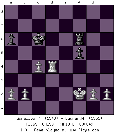 Last move : 1-0 2010 December 9 11:54:35 [Event "FICGS__CHESS__RAPID_D__000049"] [Site "FICGS"] [Date "2010.12.08"] [Round "1"] [White "Guralivu,Paul-Iosif"] [Black "Budnar,Milos"] [Result "1-0"] [WhiteElo "1349"] [BlackElo "1351"] 1.e4 e5 2.Nf3 Nc6 3.Bb5 a6 4.Ba4 Nf6 5.O-O Nxe4 6.Re1 d5 7.Bxc6+ bxc6 8.d3 Nd6 9.Nxe5 Be6 10.Nxc6 Qd7 11.Nd4 h6 12.Nc3 c6 13.Nce2 g5 14.f4 Bg7 15.fxg5 Nb5 16.c3 Nxd4 17.Nxd4 O-O-O 18.Nxe6 fxe6 19.Qe2 Rde8 20.gxh6 Bxh6 21.Bxh6 Rxh6 22.Qe5 Qc7 23.Qxc7+ Kxc7 24.Re5 Kd6 25.Rae1 Rf8 26.d4 Rf5 27.Rxf5 exf5 28.Re5 Rf6 29.Kf2 c5 30.c4 cxd4 31.Rxd5+ Kc6 32.Rxd4 1-0 Ruy Lopez : Open (Tarrasch) defense Kingside Castling by player White (move 5) Queenside Castling by player Black (move 17) Player White won this chess game. Follow this game move after move (download)Only sissies Castle. (Rob Sillars) Im Fernschach kannst du während dem Spiel rauchen. (John Christen Knudsen) La única cosa que los jugadores de Ajedrez tienen en común, es el Ajedrez. (Lodewijk Prins) Mais l'homme est une créature légère et illogique : semblable au joueur d'échecs, il n'aime que le processus du but à atteindre, non le but lui-même. (Dostoïevsky) Hold em is to stud what chess is to checkers. (Johnny Moss)