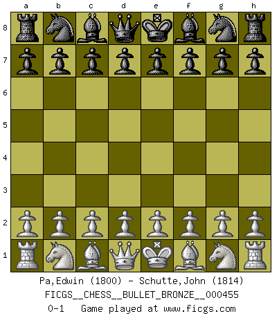 Last move : 0-1 2010 December 9 22:24:40 [Event "FICGS__CHESS__BULLET_BRONZE__000455"] [Site "FICGS"] [Date "2010.12.09"] [Round "1"] [White "Pa,Edwin"] [Black "Schutte,John"] [Result "0-1"] [WhiteElo "1800"] [BlackElo "1814"] 0-1 This chess game has been lost on time (started : 2010.12.09 19:1:40) Player Black won this chess game. Follow this game move after move (download)If your opponent offers you a draw, try to work out why he thinks he's worse off. (Nigel Short) Ohne ihre Erfolge schmälern zu wollen würde ich sagen Petrosian, Spassky und Karpov verdanken ihre Siege ihren Trainern - Boleslavsky, Bondarevsky und Furman. (Mikhail Moiseyevich Botvinik) ¿Cual es el objetivo de jugar una apertura de gambito?... Para adquirir una reputación de ser un jugador apuesto a costo de perder el juego. (Siegbert Tarrasch) L'action d'une oeuvre littéraire se déroule sur un champ de bataille. Les masques et les types du drame moderne correspondent aux pièces du jeu d'échecs. L'intrigue correspond aux coups et aux gambits, c'est à dire aux techniques du jeu telles qu'utilisées et interprétées par les joueurs. Les tactiques et les péripéties [mouvements] correspondent aux coups exécutés par l'adversaire. (Viktor Shklovsky) Experience is the name we all give to our mistakes. (Oscar Wilde)
