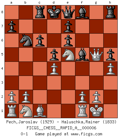Last move : 0-1 2007 February 27 11:59:5 [Event "FICGS__CHESS__RAPID_A__000006"] [Site "FICGS"] [Date "2006.12.03"] [Round "1"] [White "Pech,Jaroslav"] [Black "Haluschka,Rainer"] [Result "0-1"] [WhiteElo "1929"] [BlackElo "1833"] 1.e4 c5 2.c3 Nf6 3.e5 Nd5 4.d4 cxd4 5.Nf3 Nc6 6.cxd4 d6 7.Bc4 Nb6 8.Bb5 d5 9.O-O g5 10.Nxg5 Bf5 11.e6 fxe6 12.Qh5+ Bg6 13.Qe2 Bf5 14.Qh5+ Bg6 15.Qe2 Bf5 16.Bxc6+ bxc6 17.Qh5+ Kd7 18.Nf7 Qe8 19.Ne5+ Kd8 20.Qg5 h5 21.h4 Rc8 0-1 This chess game has been lost on time (started : 2006.12.03 10:30:27) Sicilian : Alapin's variation (2.c3) Kingside Castling by player White (move 9) Player Black won this chess game. Follow this game move after move (download)The hardest game to win is a won game. (Emanuel Lasker) Mein Gehirn das ist mein zweitwichtigstes Organ [Aus dem Film: Der Schläfer]. (Woody Allen) No nos podemos resistir a la fascinación de un sacrificio ya que la pasión por los sacrificios es parte de la naturaleza de un jugador de Ajedrez. (Rudolf Spielman) Les échecs sont un jeu terrible. Si vous n'avez pas le centre, votre adversaire a une position plus libre. Par contre, si vous avez le centre, alors vous avez vraiment quelque chose pour laquelle vous inquiéter ! (Siegbert Tarrasch) Every vice is only an exaggeration of a necessary and virtuous function. (Ralph Waldo Emerson, Journals 1936)