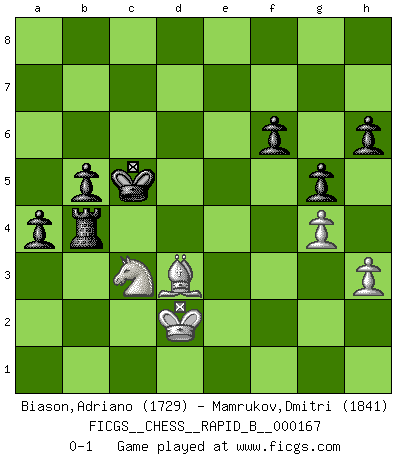 Last move : 0-1 2011 March 2 22:52:48 [Event "FICGS__CHESS__RAPID_B__000167"] [Site "FICGS"] [Date "2010.12.10"] [Round "1"] [White "Biason,Adriano"] [Black "Mamrukov,Dmitri"] [Result "0-1"] [WhiteElo "1729"] [BlackElo "1841"] 1.d4 d5 2.c4 c6 3.Nf3 Nf6 4.Nc3 dxc4 5.a4 Bf5 6.Ne5 Nbd7 7.Nxc4 Nb6 8.Ne5 a5 9.g3 e6 10.Bg2 Bb4 11.O-O O-O 12.e3 h6 13.Qe2 Bh7 14.Rd1 Nfd7 15.Nd3 Qe7 16.e4 Rfd8 17.Bd2 e5 18.dxe5 Nxe5 19.Nxe5 Qxe5 20.Be3 Bc5 21.Rac1 Bxe3 22.Qxe3 Nc4 23.Qe2 Nb6 24.Bf1 Nd7 25.f3 Qc5+ 26.Kh1 Qb4 27.Qe3 Ne5 28.Be2 f6 29.b3 Kh8 30.Rb1 Rxd1+ 31.Rxd1 Bg8 32.f4 Bxb3 33.Rd4 Nc4 34.Qd3 Rg8 35.g4 Qa3 36.Rxc4 Bxc4 37.Qxc4 Qc1+ 38.Kg2 Qxf4 39.Qd3 Qc7 40.Qg3 Qxg3+ 41.Kxg3 Rd8 42.Kf4 Rd2 43.Ke3 Rc2 44.Kd3 Rb2 45.Ke3 g5 46.h3 Kg7 47.Kd4 Kf8 48.Ke3 Ke7 49.Nd1 Rb3+ 50.Kd2 Kd6 51.Ne3 b5 52.Bd1 Rb4 53.axb5 cxb5 54.Nd5 Rxe4 55.Nc3 Rb4 56.Be2 Kc5 57.Bd3 a4 0-1 QGD Slav : Krause attack Kingside Castling by player White (move 11) Kingside Castling by player Black (move 11) Player Black won this chess game. Follow this game move after move (download)Look at Garry Kasparov. After he loses, invariably he wins the next game. He just kills the next guy. That's something that we have to learn to be able to do. (Maurice Ashley) Drei Punkte vor allen anderen ist wie einer, der im weißen Anzug posiert, während der Rest in Müllsäcke gekleidet dasteht. (Viktor Kortschnoi) En un gambito tu regalas un Peón por el bién de tomar un juego perdido. (Samuel Standige Boden) Les écrivains ont utilisé les échecs pour analyser les côtés extrêmes de la nature humaine. Dans ce cadre, les échecs offrent un champ d'expérimentation idéal. Mais on pourrait faire la même chose avec la peinture. Et là, en vous référant à Van Gogh, vous ne tirerez pas de conclusion définitive sur les peintres. (Gary Kasparov) Every now and then a man's mind is stretched by a new idea and never shrinks back to its former dimensions. (Oliver Wendell Holmes, Sr.)