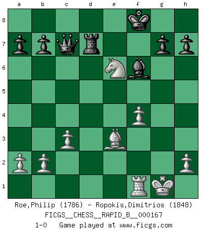 Last move : 1-0 2011 January 2 15:40:35 [Event "FICGS__CHESS__RAPID_B__000167"] [Site "FICGS"] [Date "2010.12.10"] [Round "1"] [White "Roe,Philip"] [Black "Ropokis,Dimitrios"] [Result "1-0"] [WhiteElo "1786"] [BlackElo "1848"] 1.e4 c6 2.d4 d5 3.f3 dxe4 4.fxe4 e5 5.Nf3 exd4 6.Bc4 Qa5+ 7.Nbd2 Bg4 8.O-O Nf6 9.Nb3 Qc7 10.Qxd4 Bxf3 11.gxf3 Nbd7 12.e5 Nd5 13.Bxd5 cxd5 14.Qxd5 Be7 15.f4 O-O 16.Be3 Rac8 17.c3 Rfd8 18.e6 fxe6 19.Qxe6+ Kf8 20.Rad1 Nf6 21.Rxd8+ Rxd8 22.Nd4 Rd7 23.Qxf6+ Bxf6 24.Ne6+ 1-0 Caro-Kann : Tartakower (fantasy) variation Kingside Castling by player White (move 8) Kingside Castling by player Black (move 15) Player White won this chess game. Follow this game move after move (download)The blunders are all there on the board, waiting to be made. (Savielly Tartakover) Ein Teil des Fehlers ist immer korrekt. (Savielly Grigorievitsch Tartakower) El Ajedrez te enseña a controlarl la excitación inicial que sientes cuando vez algo que parece bueno y te enseña a pensar objetivamente cuando te encuentras en problemas. (Stanley Kubrick) Le profane ne songe pas à la somme de jouissance dont il se prive, qui méconnaît ce jeu aux ressources aussi variées que passionnantes. (Jean-Marie Jeanton-Lamarche) I'll be back. (Arnold Schwarzenegger)