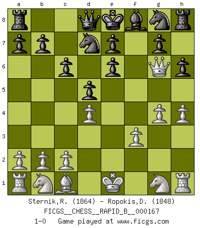 Last move : 1-0 2010 December 13 16:18:43 [Event "FICGS__CHESS__RAPID_B__000167"] [Site "FICGS"] [Date "2010.12.10"] [Round "1"] [White "Sternik,Ryszard"] [Black "Ropokis,Dimitrios"] [Result "1-0"] [WhiteElo "1864"] [BlackElo "1848"] 1.e4 c6 2.d4 d5 3.e5 Bf5 4.h4 h6 5.g4 Be4 6.f3 Bh7 7.e6 fxe6 8.Bd3 Bxd3 9.Qxd3 Nd7 10.Qg6+ 1-0 Caro-Kann : Advance variation Player White won this chess game. Follow this game move after move (download)The Pawns are the soul of the game. (Francois Andre Danican Philidor) Wer sich die Fähigkeit anerziehen will im Schach selbstständig zu denken, der muß alles meiden, was leblos ist: ausgeklügelte Theorien, die sich auf sehr wenige Beispiele und eine Menge Hirngespinste stützen. (Emanuel Lasker) No es tiempo de jugar al Ajedrez cuando la casa esta en llamas. (Proverbio Italiano) Le système Elo représente seulement une moyenne. Il est simplement un indicateur de votre stabilité. (Anatoli Karpov) The general who wins the battle makes many calculations in his temple before the battle is fought. The general who loses makes but few calculations beforehand. (Sun Tzu)