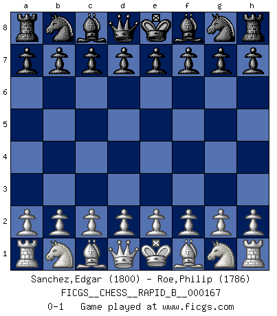 Last move : 0-1 2011 January 11 22:58:3 [Event "FICGS__CHESS__RAPID_B__000167"] [Site "FICGS"] [Date "2010.12.10"] [Round "1"] [White "Sanchez,Edgar"] [Black "Roe,Philip"] [Result "0-1"] [WhiteElo "1800"] [BlackElo "1786"] 0-1 This chess game has been lost on time (started : 2010.12.10 13:32:5) Player Black won this chess game. Follow this game move after move (download)Fischer is the strongest player in the world. In fact, the strongest player who ever lived. (Larry Evans) Dein Körper muss in Topform sein. Dein Schach verfällt, wenn dein Körper verfällt. Der Körper kann nicht vom Geist getrennt werden. (Robert James Fischer) El arma más poderosa en el Ajedrez, es tener la próxima movida. (David Bronstein) Vouloir jouer aux échecs contre soi-même est aussi paradoxal que vouloir marcher sur son ombre. (Stefan Zweig) Just because you do not take an interest in politics doesn't mean politics won't take an interest in you. (Pericles 430 B.C.)
