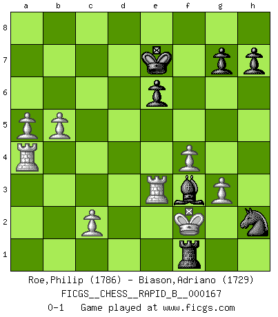 Last move : 0-1 2011 March 9 18:3:8 [Event "FICGS__CHESS__RAPID_B__000167"] [Site "FICGS"] [Date "2010.12.10"] [Round "1"] [White "Roe,Philip"] [Black "Biason,Adriano"] [Result "0-1"] [WhiteElo "1786"] [BlackElo "1729"] 1.Nc3 c5 2.Nf3 e6 3.d4 cxd4 4.Nxd4 a6 5.e4 Qc7 6.g3 b5 7.Bf4 d6 8.Bxb5+ axb5 9.Ndxb5 Qb6 10.Bxd6 Na6 11.Bxf8 Kxf8 12.Qd6+ Qxd6 13.Nxd6 Nf6 14.e5 Ng4 15.f4 Bd7 16.Ke2 Bc6 17.Rhb1 Nxh2 18.b4 Bf3+ 19.Ke3 Ke7 20.b5 Nc5 21.a4 f6 22.Nc4 Rac8 23.a5 Nd7 24.exf6+ Nxf6 25.Ra4 Rhd8 26.Kf2 Nfg4+ 27.Ke1 Ne3 28.Nxe3 Rxc3 29.Rb3 Rxe3+ 30.Rxe3 Rd1+ 31.Kf2 Rf1+ 0-1 Dunst (Sleipner, Heinrichsen) Opening Player Black won this chess game. Follow this game move after move (download)You know you're going to lose. Even when I was ahead I knew I was going to lose. - On playing against Fischer. (Andrew Soltis) Er war ein guter Schachspieler, aber ich kann Leute nicht ausstehen, die 'Heil Hitler' rufen (Über Alexander Aljechin). (Miguel Najdorf) No hay un Gran Maestro de Ajedrez que sea normal; solo se diferencían ellos por la magnitud de su locura. (Viktor Korchnoi) Le succès, c'est être capable d'aller d'échec en échec sans perdre son enthousiasme. (Winston Churchill) To send light into the darkness of men's hearts - such is the duty of the artist. (Schumann)