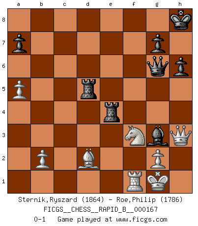 Last move : 0-1 2011 January 9 12:34:59 [Event "FICGS__CHESS__RAPID_B__000167"] [Site "FICGS"] [Date "2010.12.10"] [Round "1"] [White "Sternik,Ryszard"] [Black "Roe,Philip"] [Result "0-1"] [WhiteElo "1864"] [BlackElo "1786"] 1.e4 e5 2.f4 d5 3.exd5 exf4 4.Nf3 Nf6 5.Bb5+ c6 6.dxc6 Nxc6 7.d4 Bd6 8.Qe2+ Be6 9.Ng5 O-O 10.Nxe6 fxe6 11.Qxe6+ Kh8 12.Bxc6 bxc6 13.O-O Qc7 14.Nd2 Rae8 15.Qc4 f3 16.Nxf3 Ng4 17.Kh1 Bxh2 18.Bd2 Bg3 19.d5 Nf2+ 20.Rxf2 Bxf2 21.dxc6 Rf6 22.Rf1 Bb6 23.Bg5 Rxc6 24.Qb5 Rce6 25.Qf5 h6 26.Bd2 Rf6 27.Qh3 Qxc2 28.Bc3 Qd3 29.Rc1 Rfe6 30.a4 Qg6 31.a5 Bf2 32.Rd1 Bg3 33.Rf1 Re4 34.Kg1 Rd8 35.Bd2 Rd5 0-1 KGD : Falkbeer counter-gambit Kingside Castling by player Black (move 9) Kingside Castling by player White (move 13) Player Black won this chess game. Follow this game move after move (download)The Pawns are the soul of the game. (Francois Andre Danican Philidor) Fischer: 'Remis!?' Uhlmann: 'Aber es muss doch dreimal Zugwiederholung sein!' Fischer: 'Sie nehmen das Remis an, wie ich es sage, sonst spiele ich weiter und werde Sie dann schlagen!' (Robert James Fischer) Después de una mala apertura, hay una esperanza en el juego medio. Pero una vez que estas en finales, el momento de la verdad ha llegado. (Edmar Mednis) Des combinaisons [dans le jeu d'échecs] pareilles à des mélodies. Je crois entendre pour ainsi dire la musique des coups... (Vladimir Nabokov) There is a very easy way to return from a casino with a small fortune : go there with a large one. (Jack Yelton)