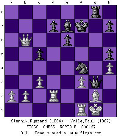 Last move : 0-1 2011 January 13 11:19:8 [Event "FICGS__CHESS__RAPID_B__000167"] [Site "FICGS"] [Date "2010.12.10"] [Round "1"] [White "Sternik,Ryszard"] [Black "Valle,Paul"] [Result "0-1"] [WhiteElo "1864"] [BlackElo "1867"] 1.e4 b5 2.Bxb5 Bb7 3.d3 f5 4.Nf3 a6 5.Bc4 fxe4 6.dxe4 e6 7.O-O Nc6 8.Qe2 Nh6 9.Rd1 Qf6 10.Bg5 Qf7 11.h3 Bd6 12.e5 Bc5 13.Bxh6 gxh6 14.Nbd2 Rg8 15.Ne4 Be7 16.Qd3 Rd8 17.Qe3 h5 18.Bf1 Nb4 19.Ne1 Nd5 20.Qa7 Ba8 21.Qd4 Qf5 22.Ng3 Qg5 23.Rd3 c5 24.h4 Qg7 25.Qc4 Qxe5 26.c3 Rg4 27.Qxa6 Bc6 28.Nf3 Qg7 29.Rd2 Nf4 30.Rad1 Ra8 31.Qb6 Bxf3 32.gxf3 Rxg3+ 33.fxg3 Qxg3+ 34.Bg2 Kf7 35.Rf1 Rg8 0-1 King's pawn Opening Kingside Castling by player White (move 7) Player Black won this chess game. Follow this game move after move (download)A win by an unsound combination, however showy, fills me with artistic horror. (Wilhelm Steinitz) Der Umstand, daß uns eine 7 Stunden Zeitkontrolle ermöglicht eine großartige, tiefe Partie zu spielen, ist für die Massenmedien nicht weiter von Bedeutung. (Alexej Shirov) Hay jugadores fuertes y personas amables y yo soy un jugador fuerte. (Bobby Fischer) Le jeu d'échecs est comme rejeté hors du temps. (Antoine de Saint-Exupéry) Life is pain my dear and anyone who says otherwise is selling something. (Princess Bride)