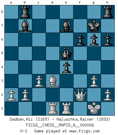 Last move : 0-1 2007 January 29 15:6:26 [Event "FICGS__CHESS__RAPID_A__000006"] [Site "FICGS"] [Date "2006.12.03"] [Round "1"] [White "Dadban,Ali"] [Black "Haluschka,Rainer"] [Result "0-1"] [WhiteElo "2169"] [BlackElo "1833"] 1.e4 c5 2.Nf3 d6 3.d4 cxd4 4.Nxd4 Nf6 5.Nc3 e5 6.Ndb5 a6 7.Na3 b5 8.Nd5 Nbd7 9.Bg5 h6 10.Bxf6 Nxf6 11.c3 Nxd5 12.Qxd5 Rb8 13.Rd1 Bb7 14.Qd3 Qh4 15.Nxb5 axb5 16.Qxb5+ Ke7 17.Bd3 g6 18.Qb6 Kf6 19.O-O Kg7 20.Qa7 Be7 21.g3 Qf6 22.f4 d5 23.fxe5 Qxe5 24.Qf2 f6 25.Rfe1 dxe4 0-1 Sicilian Kingside Castling by player White (move 19) Player Black won this chess game. Follow this game move after move (download)Blessed be the memory of him who gave the world this immortal game. (A. G. Gardiner) Ich verstehe den Grund nicht, warum die Aufteilung in Frauen und Männer überhaupt im Schach besteht. (Judith Polgar) Fischer deseaba darle a los Rusos una sopa de su propia medicina. (Larry Evans) Si je n'étais pas joueur d'échecs, je serais le meilleur dans quelque chose d'autre. (Anatoli Karpov) Internet: Absolute communication, absolute isolation. (Paul Carvel)
